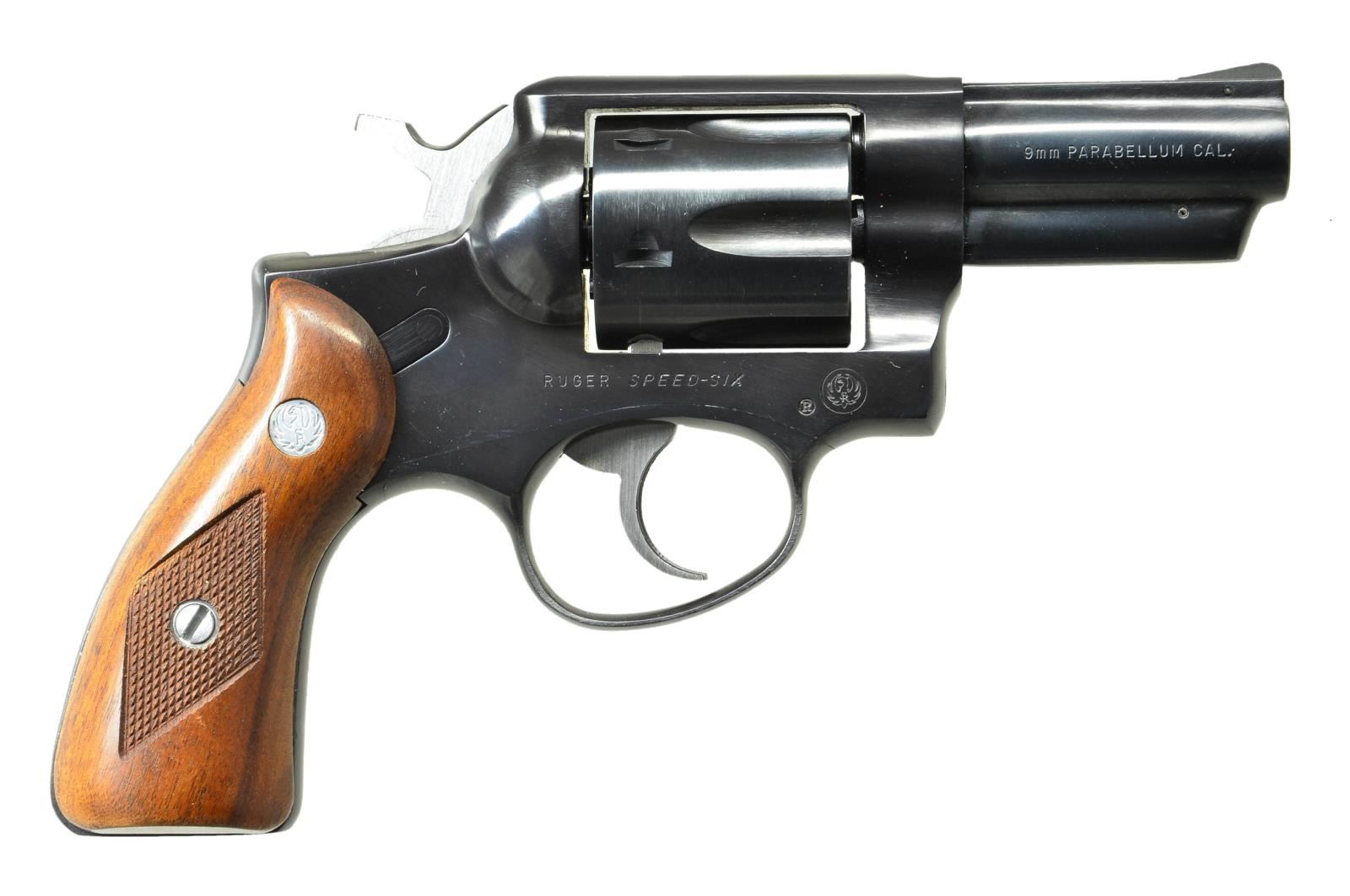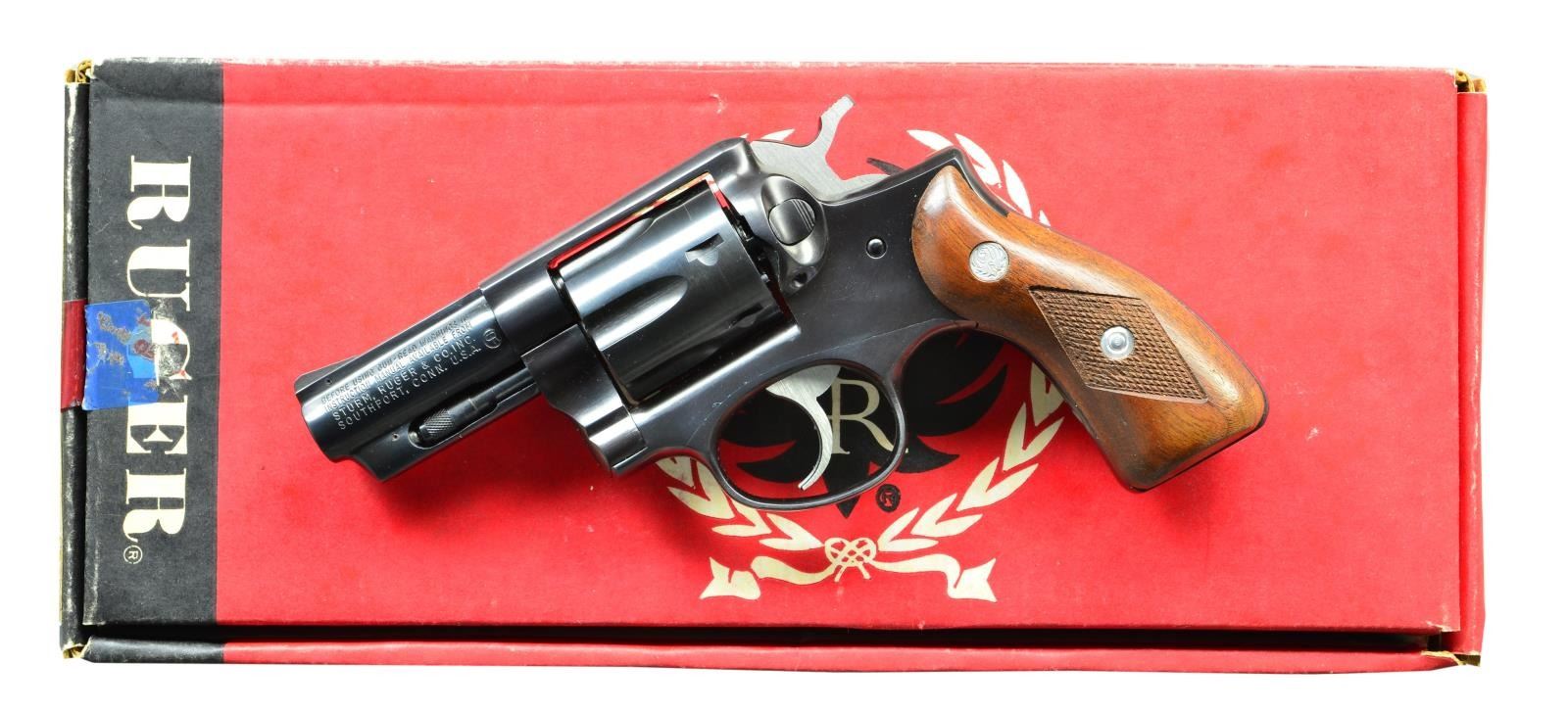 Cal. 9mm Para (9mm Luger). S# 159-95826. Bbl. 2 3/4" w/ serrated ramp blade sight, grooved rib & protected ejector rod. Mfg. 1984 (1970-1988) but shipped 2011; per references & Ruger website that also called it a Single-Six. Blued rnd. butt Model 01592 w/ checkered walnut service grips having silver eagle medallions. Warning marks on left side of bbl. & grooved top strap sight. Uncommon model often for foreign sales in this cal.; also unusual to be retained by the factory for 27 years. Internet research failed to show any auction sale such as by Ruger to benefit a charity. UNATTACHED ACCESSORIES: vintage red & black 1 piece box w/ very simple white bar code label over plain white label w/ X's & "OK" that is over the original box label (unreadable). Right end of box opposite label w/ "SS92" (it's original model designation) & "95826". 1-86 manual & Ruger plastic bag. CONDITION: all aspects near excellent w/ unfired appearance. PROVENANCE: Estate collection of Fred Inganamort. ( 22-1761/NW). MODERN. $600-900.