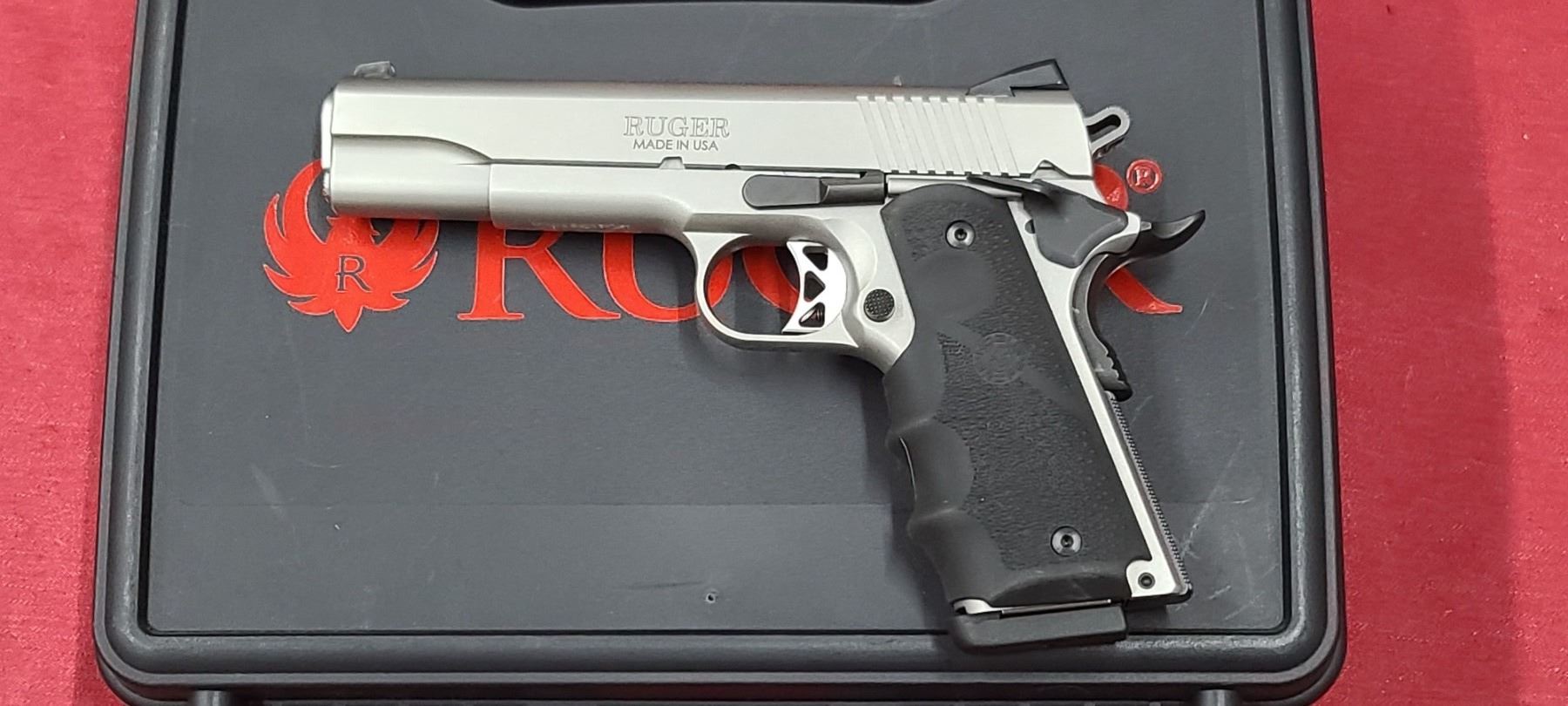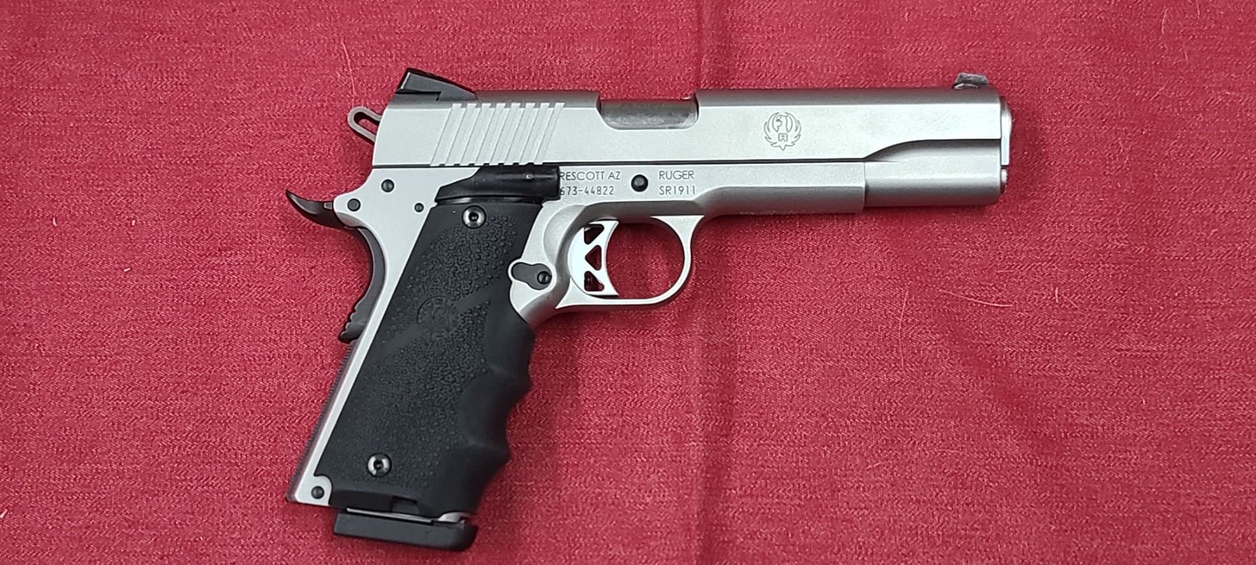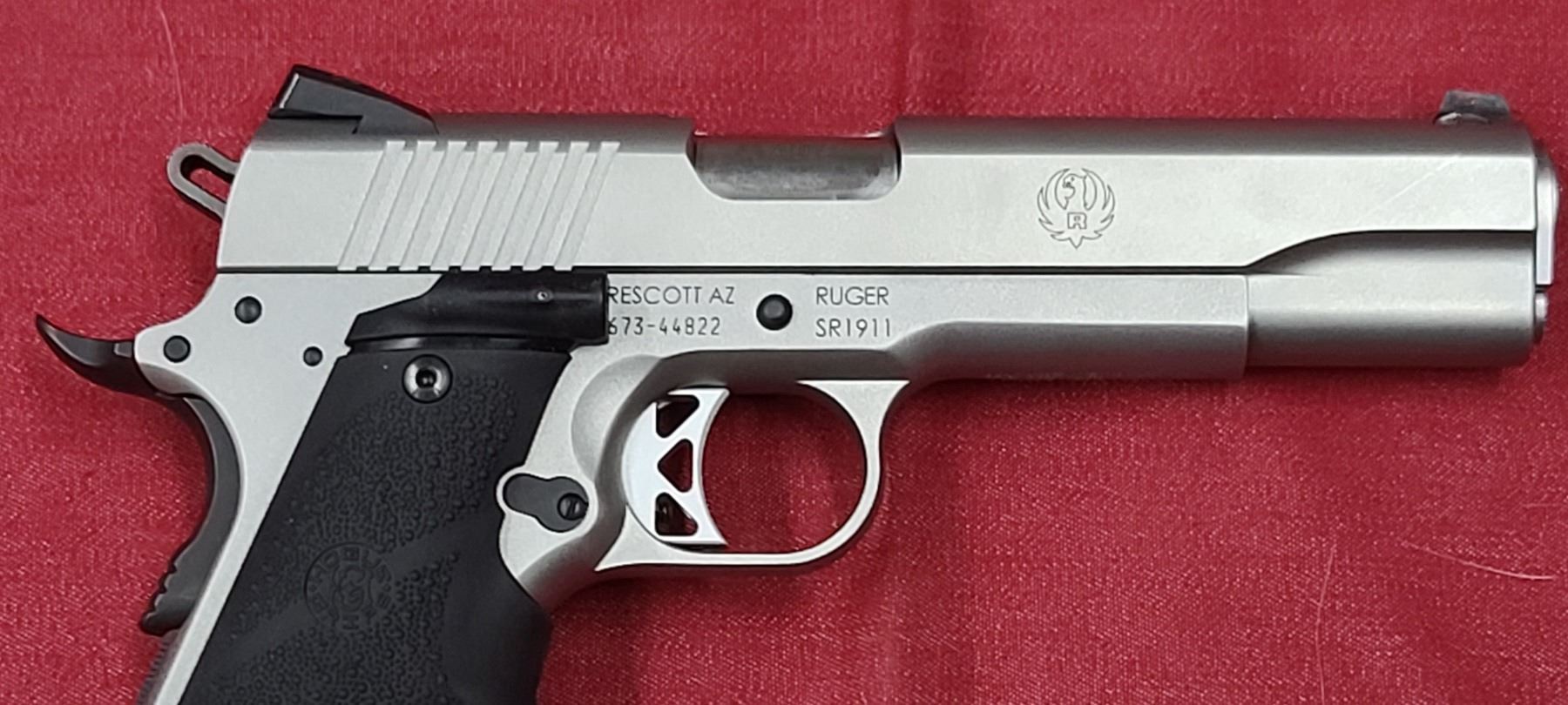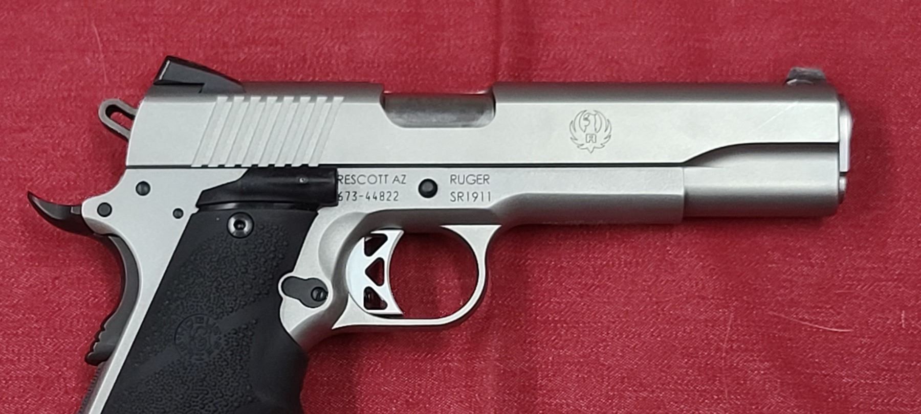 RUGER SR1911 .45 AUTO 5" BARREL - SILVER - SERIAL NUMBER:672-4482 - SALE OF PISTOL IS SUBJECT TO FEDERAL FIREARMS LAWS OF CANADA REGARDING WHO CAN PURCHASE A PISTOL
