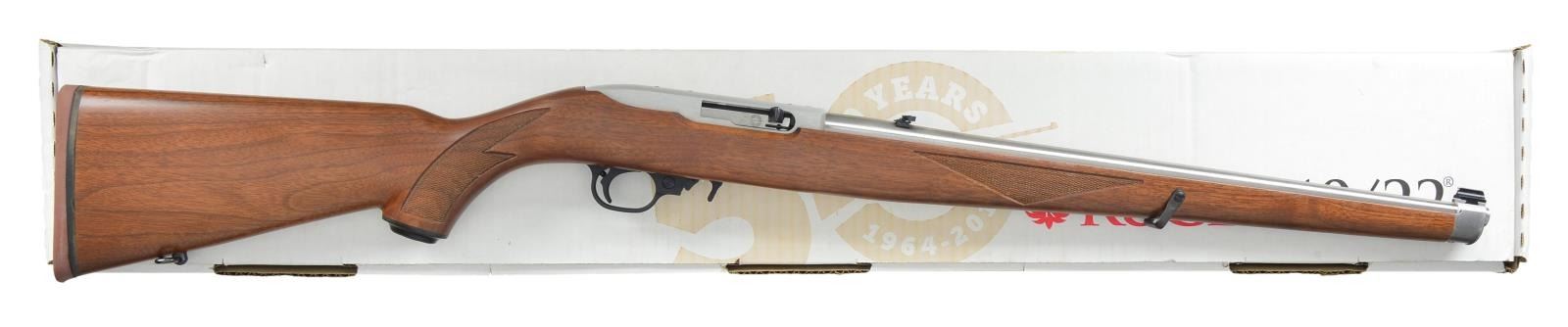 Cal. 22 LR. S# 0001-40817. Bbl. 18 1/2" w/ brass bead front sight & folding leaf rear. Mfg. 2014 (catalog #01264; K10/22 RBIW) w/ checkered walnut mannlicher stock having sling swivels & red rubber buttpad. Bolt w/ 50th year markings; 10/22 introduced 1964. Late production features to include: Allen head takedown screw, extended mag. release, 4 digit S# prefix, & polymer trigger housing. MAGS: 1 factory 10 rd. UNATTACHED ACCESSORIES: original 50 year marked box & packaging. CONDITION: all aspects near excellent appearing new. (22-2673/NW). MODERN. $350-500.