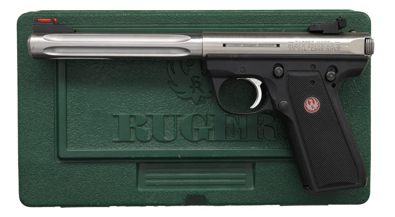 PISTOL. Cal. 22 LR. S# 270-05994. Bbl. 6 7/8" fluted bull with Hi-Viz sight allowing interchangeable colors. Mfg. 2006 (2006 to date) with frame key lock, adjustable rear sight, silver trigger, 45 auto profiled grip frame having red eagle background silver medallions. MAGS: 2 factory 10 rd. UNATTACHED ACCESSORIES: matching numbered factory green Hunter case with packaging to include scope base, lock keys and extra front sight insert colors. CONDITION: all aspects near excellent including bore; appears new and unfired. (23-1549/NW). MODERN. $450-600.