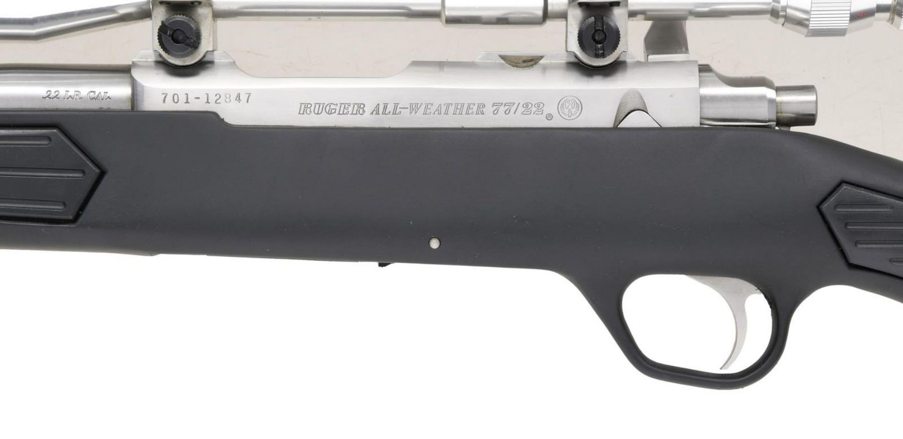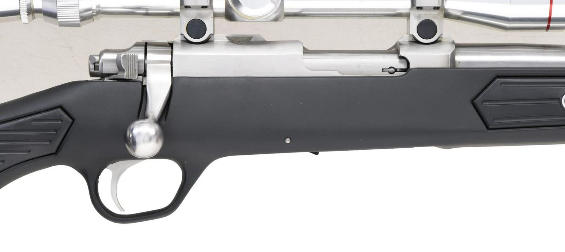ACTION RIFLE. Cal. 22 LR. S# 701-12847. Bbl. 20", without provision for sights. Mfg. 1991 (1989-2014) with black Dupont Zytel "boat paddle" stock having black grooved insert panels, recessed buttstock, integral trigger guard, grooved rubber pad, and stainless swivels. Receiver with factory scope rings holding silver Simmons 3-9X32 scope having fine duplex reticle. MAGS: 1 factory 10 rd. CONDITION: all aspects near excellent, including bore and scope set; all collector quality. (23-6350/NW). MODERN. $500-750.
