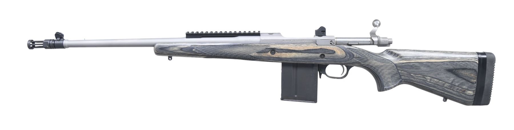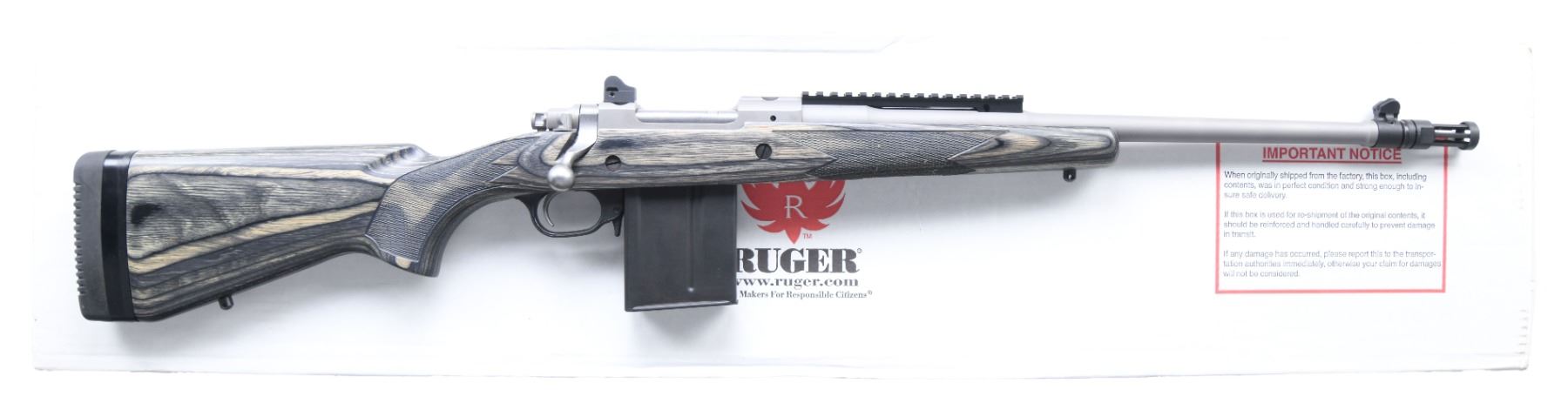 Cal. 308 Win. S# 680-67550. Bbl. 18.7" (20.5" including bird cage flash hider) hammer forged free floating with multiple steps having military style ramped blade front sight with protective ears plus adjustable ghost ring receiver mounted rear sight. Mfg. 2014 (2011 to date) as Model 06822 with catalogue designation of KM77-GS; Ruger's vision of Col. Jeff Cooper's Scout Rifle concept that originated with Cooper and Steyr. Grey and black checkered laminated stock with reinforcement bolts, sling studs, Gunsite logo laser engraved on grip cap and serrated rubber recoil pad adjustable for length of pull with included spacers. Glass reinforced nylon trigger guard assembly for durability. MAGS: 1 AI style factory 10 rd. As Ruger and Col. Cooper say, "the one gun to have if you only have one". UNATTACHED ACCESSORIES: original factory box with packaging to include Ruger scope rings. CONDITION: all aspects near excellent with new, unfired appearance. (25-756/NW). MODERN. $800-1,200.