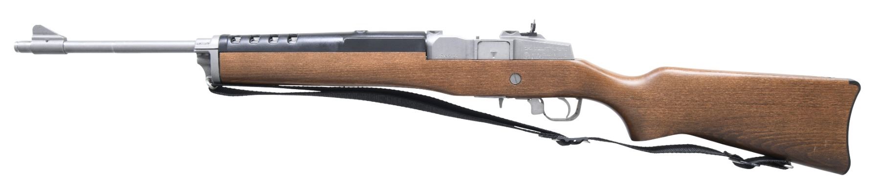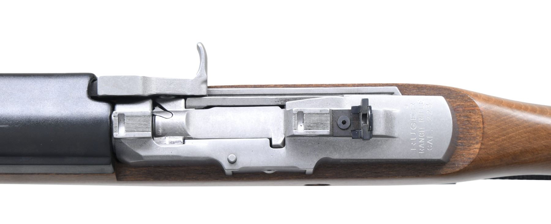 Cal. 223 Rem. S# 197-05022. Bbl. 18 1/2" with banded serrated blade front sight; folding leaf peep sight on receiver; also factory machined for Ruger scope rings. Mfg. 2003 (1982 to date for Ranch Rifles) with normal later factory features of round wire sling swivels (factory style 1 1/4" black nylon sling), walnut stained hard wood stock, black Celcon carbine buttplate, no roller on bolt lug, black fiberglass handguard and latest internal style bolt hold open latch. MAGS: 1 factory 5 rd. CONDITION: light handling marks near toe of buttplate; all other aspects near excellent including bore. (23-6535/NW). MODERN. $650-900.