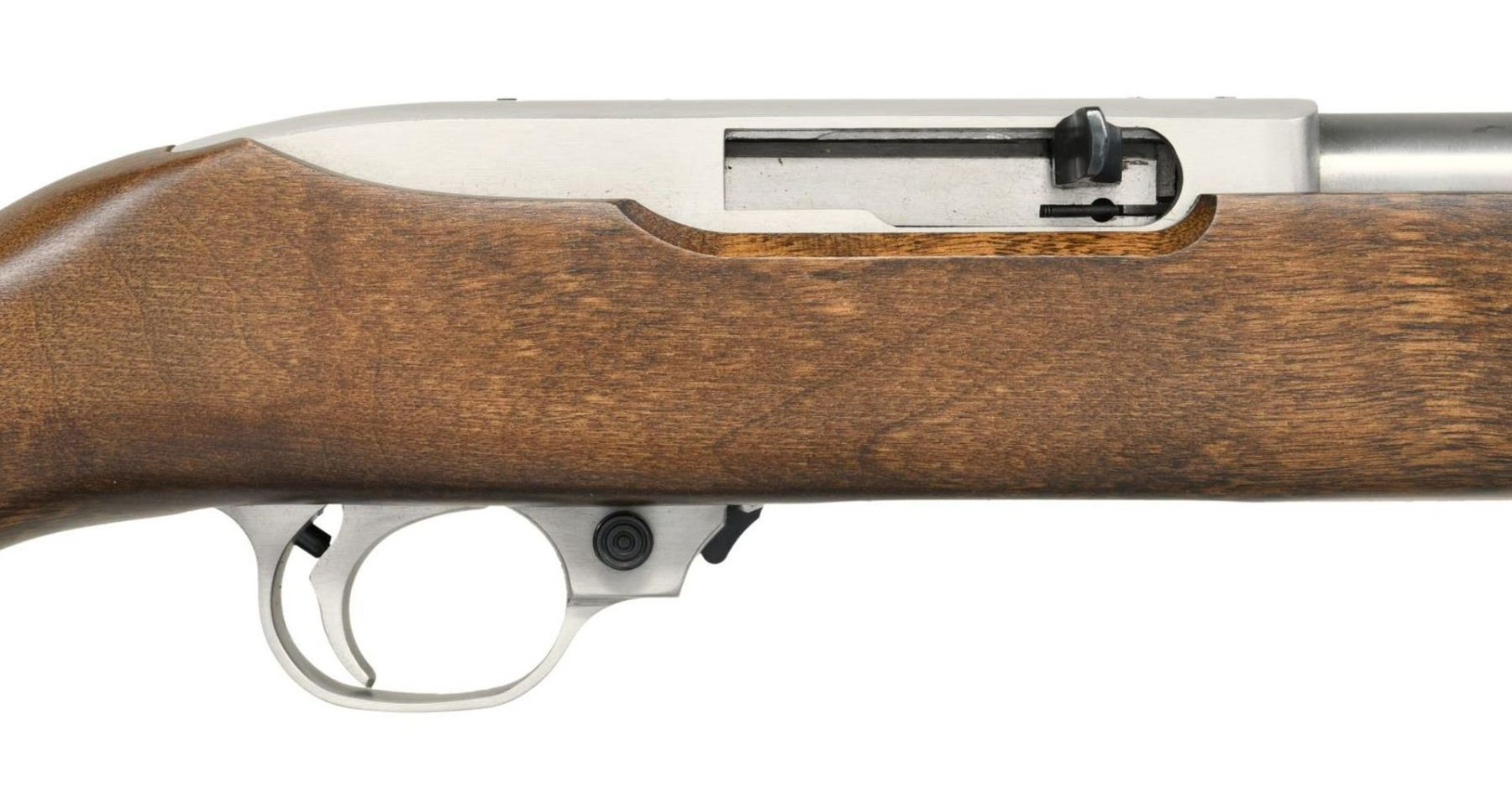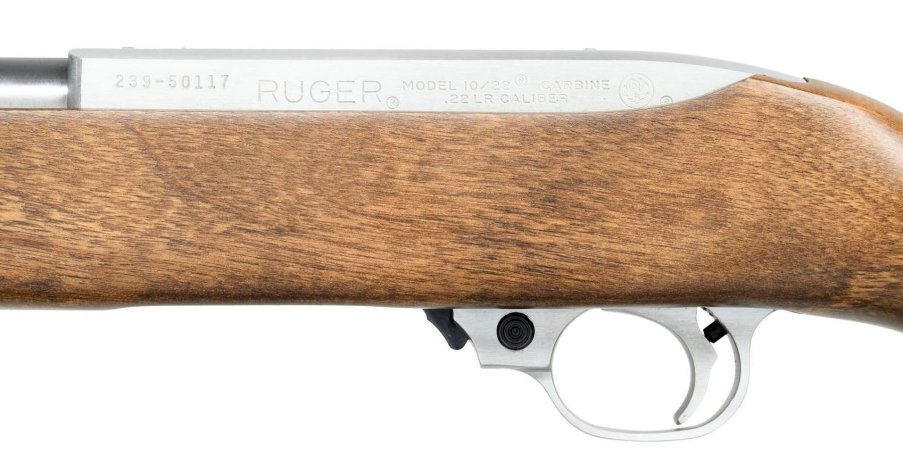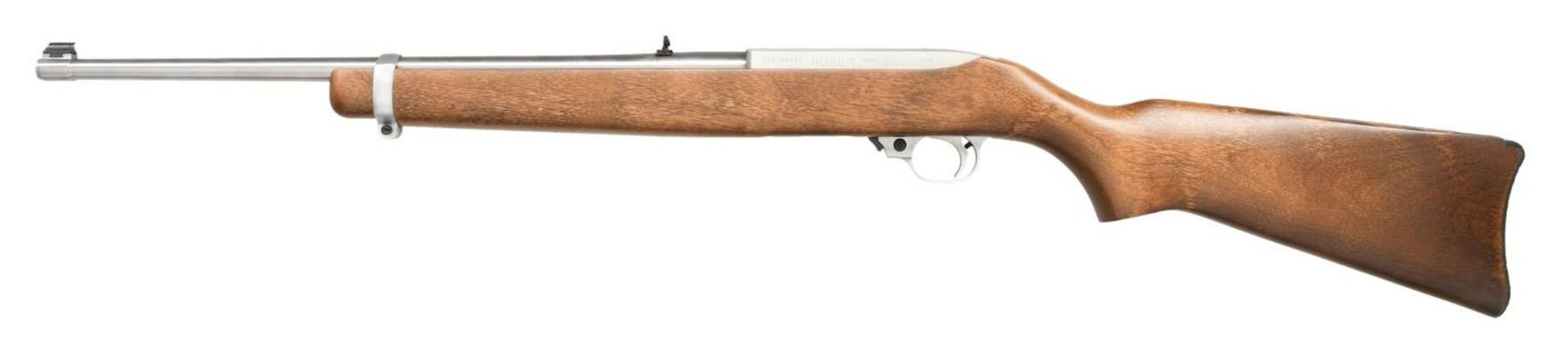 Cal. 22 LR. S# 239-50117. Bbl. 18 1/2" having brass bead front sight and folding leaf rear. Mfg. 1994 as Model 01116 having natural finished alloy receiver and barrel band. Walnut stained hardwood stock set with black plastic buttplate. MAGS: 4 Condor Mfg. 25 rd. Readily available from Ruger and aftermarket sources. CONDITION: all aspects near excellent including bore; appears test fired only. (23-5321/NW). MODERN. $200-300.