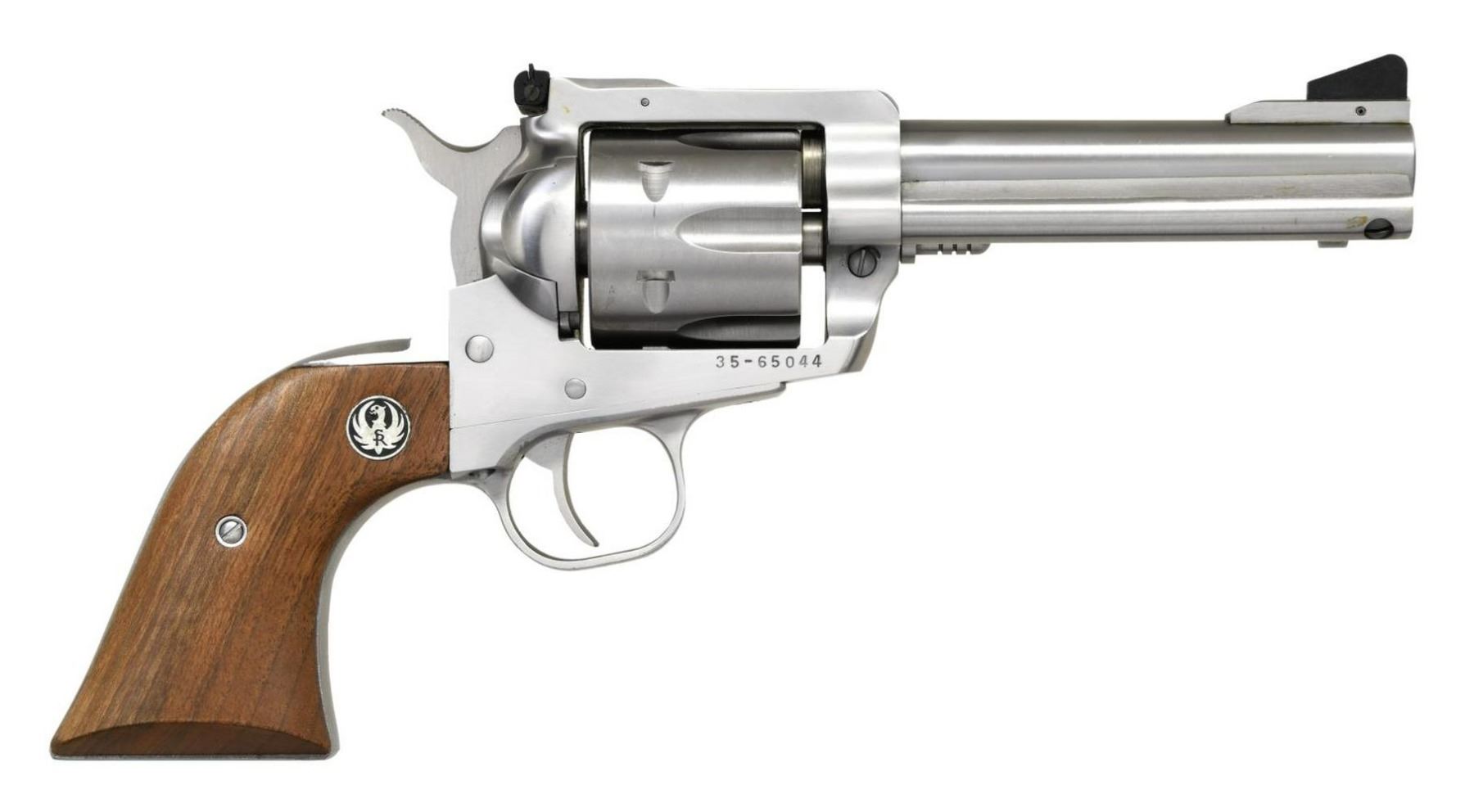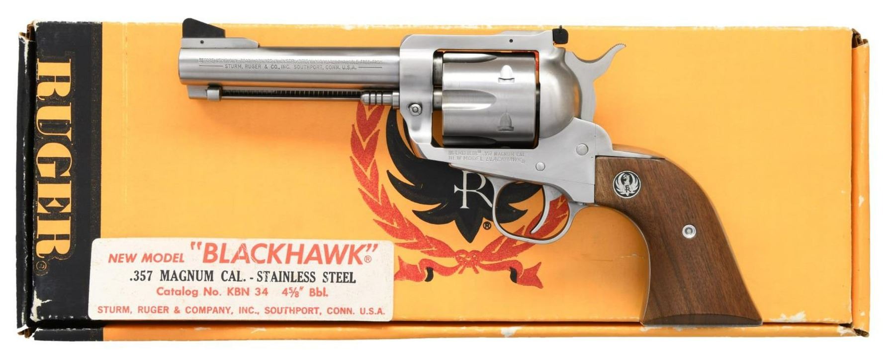 Cal. 357 Mag. S# 35-65044. Bbl. 4 5/8" with serrated blade sight pinned in ramped base; frame mounted adjustable rear. Mfg. 1981 as KBN-34 with "warning" marks on left side of barrel. Walnut grips having silver eagle medallions. Patterned after blued Blackhawk but with stainless grip frame instead of alloy thus adding recoil absorbing heft and balance. UNATTACHED ACCESSORIES: factory yellow and black 1 piece box with included detached label plus 1-80 dated manual. CONDITION: extremely faint turn line on cylinder from functioning; all other aspects near excellent with test fired only appearance. (23-5558/NW). MODERN. $450-600.