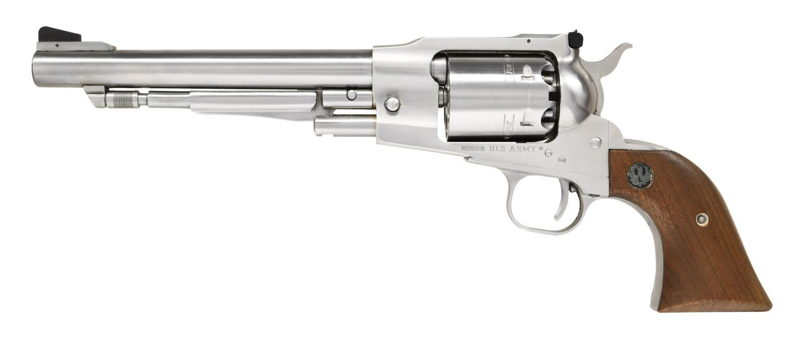 Cal. 45. S# 145-09179. Bbl. 7 1/2". Mfg. 1981. Adj. rear sight. Ramped blade front sight. Warning marks present on bbl. Wooden grips w/ silver Ruger medallions. UNATTACHED ACCESSORIES: Right hand leather Western style holster. CONDITION: grips show some light handling wear & white staining. Metal shows light handling wear. Very good bright bore. PROVENANCE: From the personal collection of Brad Shepherd. (01-23778/MJC). ANTIQUE. $400-600.