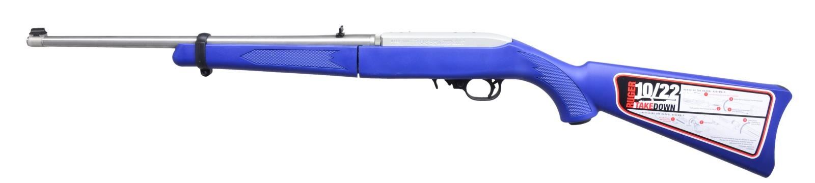 TAKEDOWN SEMI AUTO RIFLE. Cal. 22LR. S# GOLD-0003. Bbl. 18 1/2" w/ standard factory sights consisting of gold bead front & folding rear. Mfg. in quantity during 2012 as fundraising item for US Olympic Shooting Team. Limited to 5,000 units sold by Talo Distributors w/ $20 of each sale going to U. S. Olympic Shooting Team. This extremely low numbered example shipped later in 2013 to assistant U.S.A. Team Coach, Russ Doucette. Vivid blue checkered synthetic stock set w/ black Ruger logo buttplate & grip cap. MAGS: 2 factory 10 rd. TOTAL. 1 in rifle plus 1 new in package. UNATTACHED ACCESSORIES: original box w/ packaging to include red (standard is black) US Shooting Team marked carry bag plus numerous factory accessories to include: bipod, safety lock, scope adapter base & paperwork. Also includes extra red bag w/ lock, paperwork & complete bbl. assembly. CONDITION: all aspects of all items in offering are near excellent appearing new & unfired. PROVENANCE: USA Shooting Team letter conveying rifle to Russ Doucette. (21-1322/NW). MODERN. $650-900.