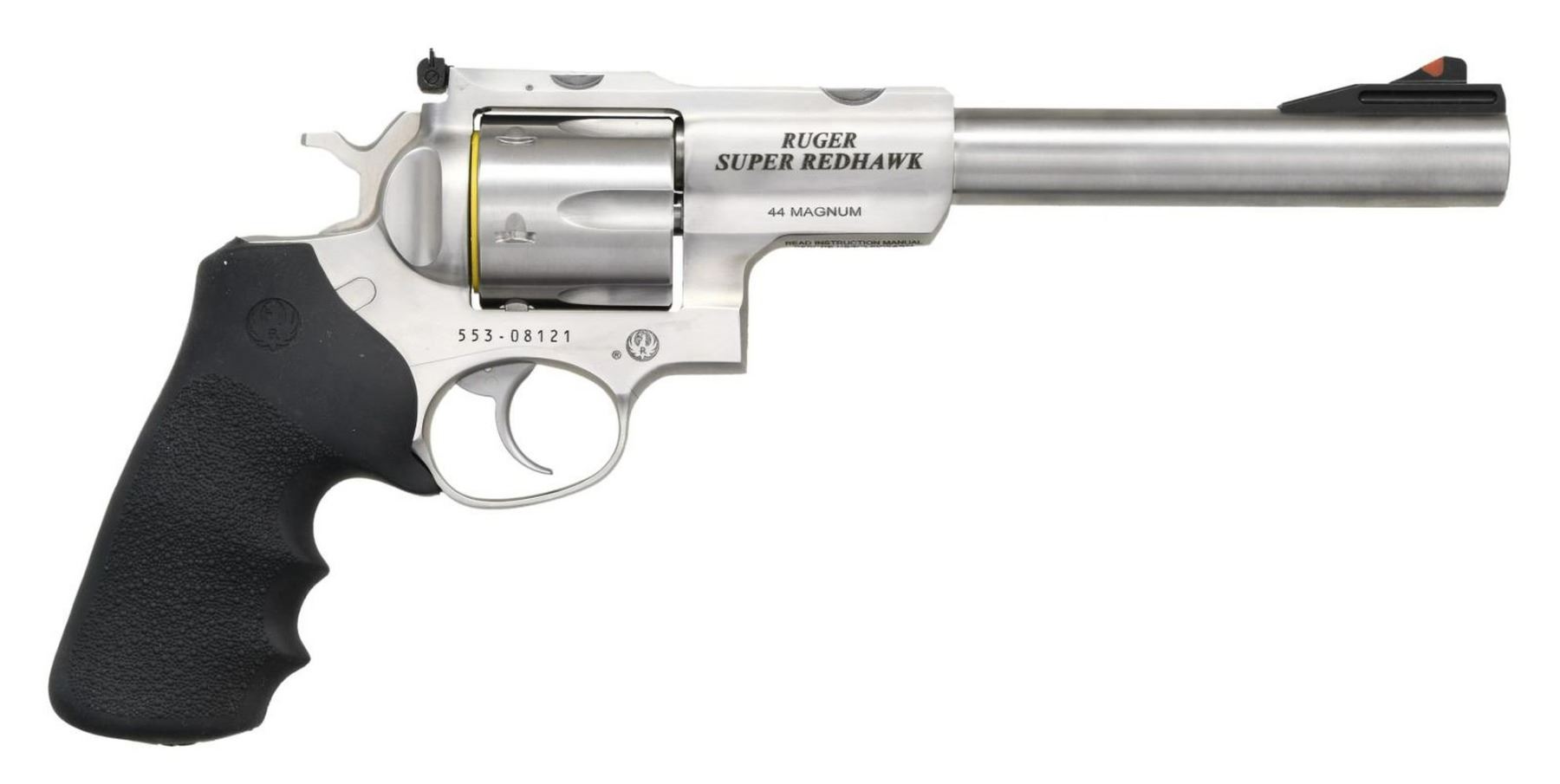 Cal. 44 Mag. S# 553-08121. Bbl. 7 1/2" bull with 11 degree target crown, red insert ramped sight blade securely attached with 3 screws, factory milled for Ruger scope rings on cylinder frame having factory white outlined adjustable rear sight. Mfg. 2022 as Model 05501 (KSRH-7) with Hogue finger grooved Tamer Monogrip of pebble grained rubber having Ruger logo. Extremely robust revolver expressly designed for scoped use. Triple locking cylinder and extended cylinder frame; both features enhance its durability to handle powerful big game loads. UNATTACHED ACCESSORIES: factory black plastic case and packaging to include set of Ruger scope rings. CONDITION: all aspects near excellent with new, unfired appearance. (23-3849/NW). MODERN. $700-950.