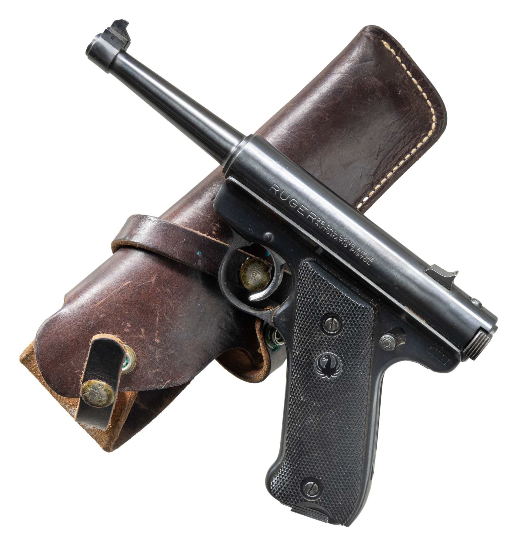 Cal. 22 LR. S# 11-22687. Mfg. 1971 as RST4. Bbl. 4.75". Patridge style blade front sight & square notch rear sight. Blued finished. A54 frame w/ black hard rubber grips with black eagle medallion. MAGS: 1 - 9 rd. w/ mag. button slot only on right side. UNATTACHED ACCESSORIES: Buchiemer brown leather holster. CONDITION: very good blue showing light wear & marks. Very good grips. Very good bore. (25-4042/MD). CURIO. $200-300.