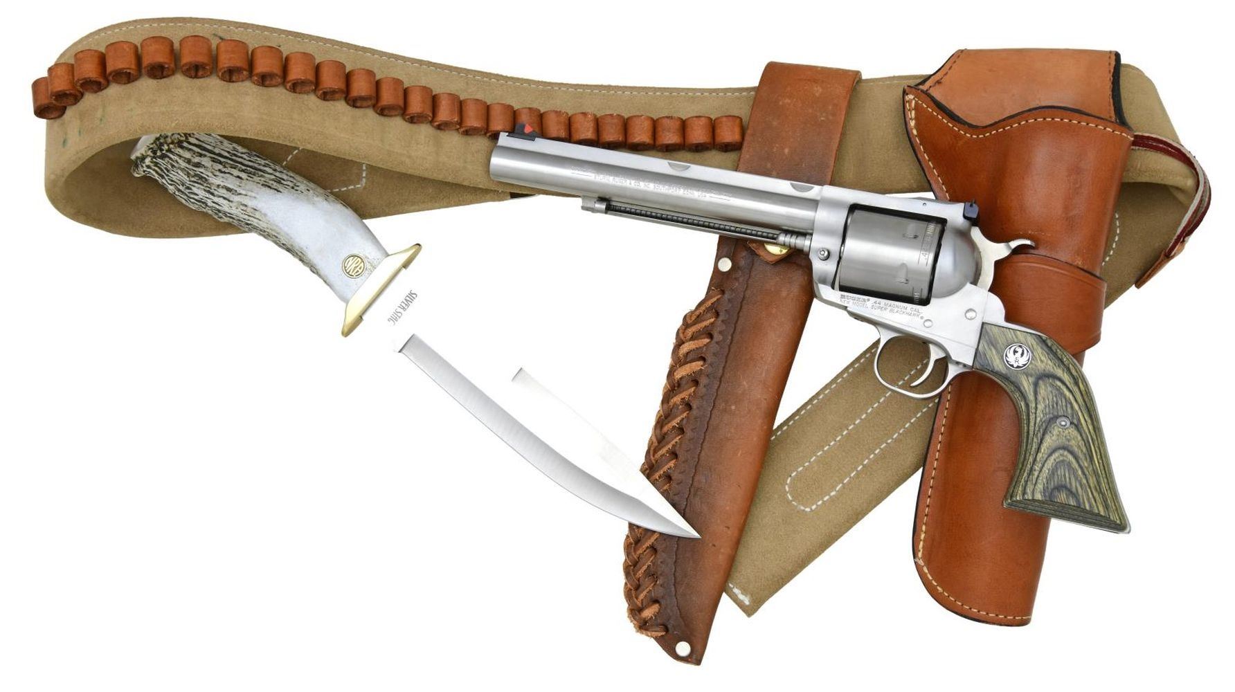 Cal. 44 Mag. S# 88-30141. Bbl. 7 1/2" with grooved rib machined for Ruger scope rings plus with user changeable blued orange insert front sight blade; cylinder frame mounted adjustable rear. Mfg. 2007 (1992 to date for Hunter models) as stainless Model 00860 with catalogue designation of KS47NH having "RUGER / HUNTER / SUPER BLACKHAWK" on top strap plus "NEW MODEL SUPER BLACKHAWK" on cylinder frame. Super style unfluted cylinder plus "XRN 3" grip frame with Hunter exclusive black laminated grips. Early issue with conventional barrel screwed into cylinder frame, long stainless ejector rod housing plus left side of barrel "warning" marks with Southport address. Wide spur Super hammer and smooth faced wide trigger. UNATTACHED ACCESSORIES: near excellent Kirkpatrick belt, holster and knife set. Belt with soft leather cover and 24 cartridge loops of 45 caliber. Belt marked with maker's info indicating "Hand-Crafted" and "Made in U.S.A."; 46" belt size. Open bottomed lined holster of western style with "1858R" on lower back (likely meaning Model 1858 Remington). Near excellent knife is clip point Bowie style with "SILVER STAG" on blade near hilt plus on back of holster along with "MADE IN THE U.S.A."; handle is synthetic horn material with NRA disk near hilt. Very attractive outfit with highly desirable Ruger revolver. CONDITION: faint cylinder turn line from functioning; all other aspects near excellent with like new appearance. (24-905/NW). MODERN. $650-900.