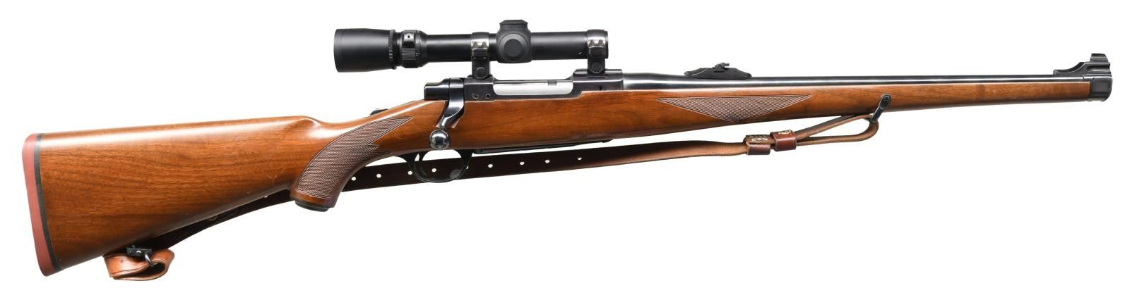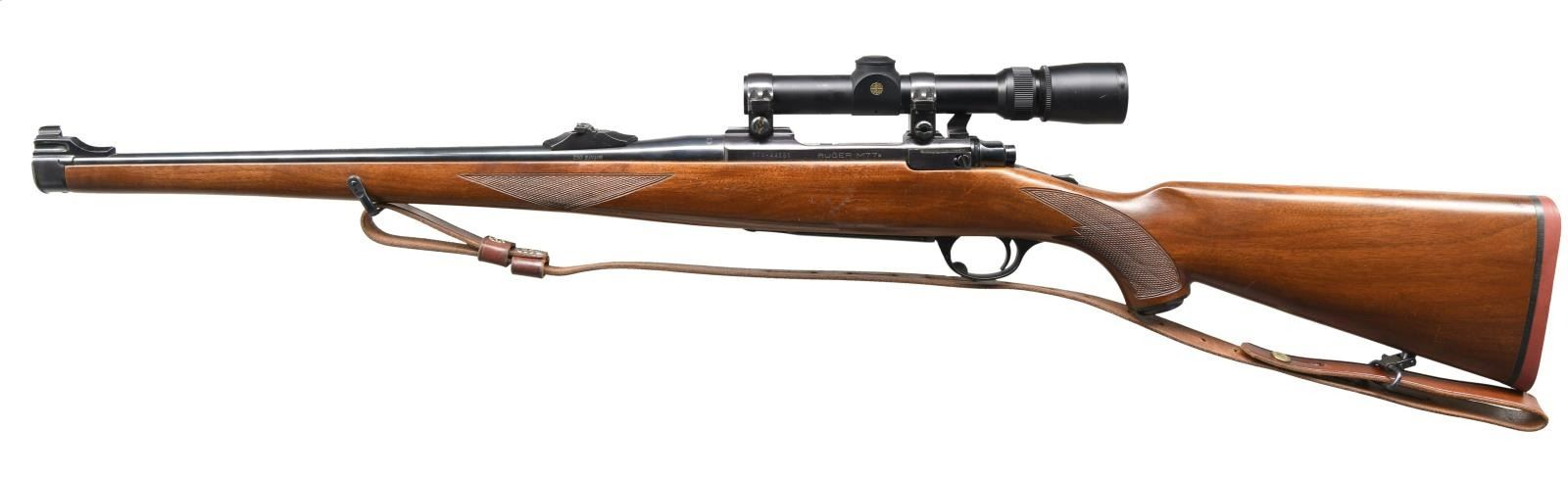 Cal. 250 Savage. S# 770-44585. Bbl. 18". 80's production tang safety rifle in a scarce caliber. Ramped gold bead front sight. Folding leaf rear sight. Leupold 1.5-6x power scope mounted on Ruger rings w/ duplex crosshair reticle & good optics. Right rear of receiver has two vacant screw holes. Blue & anodized finishes. Mannlicher walnut stock w/ bottom mounted sling hardware & leather sling. Factory red recoil pad. LOP: 13 1/2". CONDITION: stock shows scattered handling marks, light ding & scratches. Metal retains 97% original finish w/ some light handling wear. Bright near excellent bore. (23-4850/MJC). MODERN. $1000-1500.