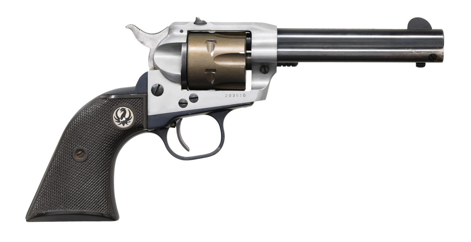 Cal. 22 LR. S# 203510. Bbl. 4 5/8" with serrated blade plus frame-mounted drift-adjustable rear (proper set screw retention). Mfg. 1956 (1956–1959; S# 200001–212534 for all variations of lightweights) as the earliest example of a lightweight with a blued barrel and small parts, a black alloy XR3 grip frame ("G" marked), a natural aluminum-colored cylinder frame, a brown Martin hard-coated aluminum cylinder, a flat loading gate (contoured on the next issue), a steel long throw off-set ejector housing, a serrated button at the end of the ejector rod, checkered black hard rubber grips, and a "skinny" early-style trigger; approximately 3,700 of this type. Replacement "drilled-through" base pin latch was first used in 1958. Lightweight Single-Six was way ahead of its time by Ruger and not well received by buyers due to unfounded concerns about aluminum's durability. CONDITION: very good overall, with some high edge thinning and light marks on the butt. Cylinder has minimal chipping of leads, which is common for the Martin hard coat. Sides of the hammer are lightly polished to alleviate "staining". Very good grips with minimal hand wear. Near-excellent bore, plus proper mechanical functioning. (23-6248/NW). CURIO. $750-1,000.
