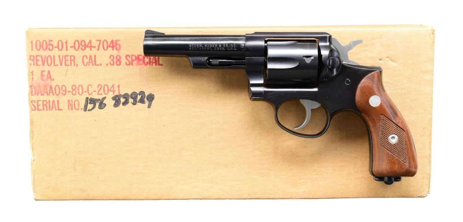 Cal. 38 Spl. S# 156-88929. Bbl. 4" ribbed with serrated blade and no "warning marks"; frame notched rear sight. Mfg. 1980 as Model SS84L with L designating its lanyard loop within serial number allowing "156" at the front half of its round butt and "88929" at the rear half (no "-" used). Right front of cylinder frame stamped "U.S." before being blued; standard checkered walnut service grips with all silver eagle medallions on round butt grip frame. August 1978 issue of American Rifleman magazine stated that 6,500 with lanyard loops were procured for Army Armament Material Development and Readiness Command. Likely sold via Ruger benefit auction as Ruger website states shipped 1995 as Model 01552 and that caliber is "38 SP". UNATTACHED ACCESSORIES: near excellent unmarked yellow and black Ruger 1 piece box. Shipping sleeve with ink pen change of serial number on label; 88929 over 82360. Top corner of sleeve has military drawing number etc. in red ink plus serial number in pen with over write by black marker. Technical Manual dated 8/80; printed by Ruger and intended for US Military use. CONDITION: all aspects are near excellent appearing new and unfired. (23-6586/NW). MODERN. $500-750.