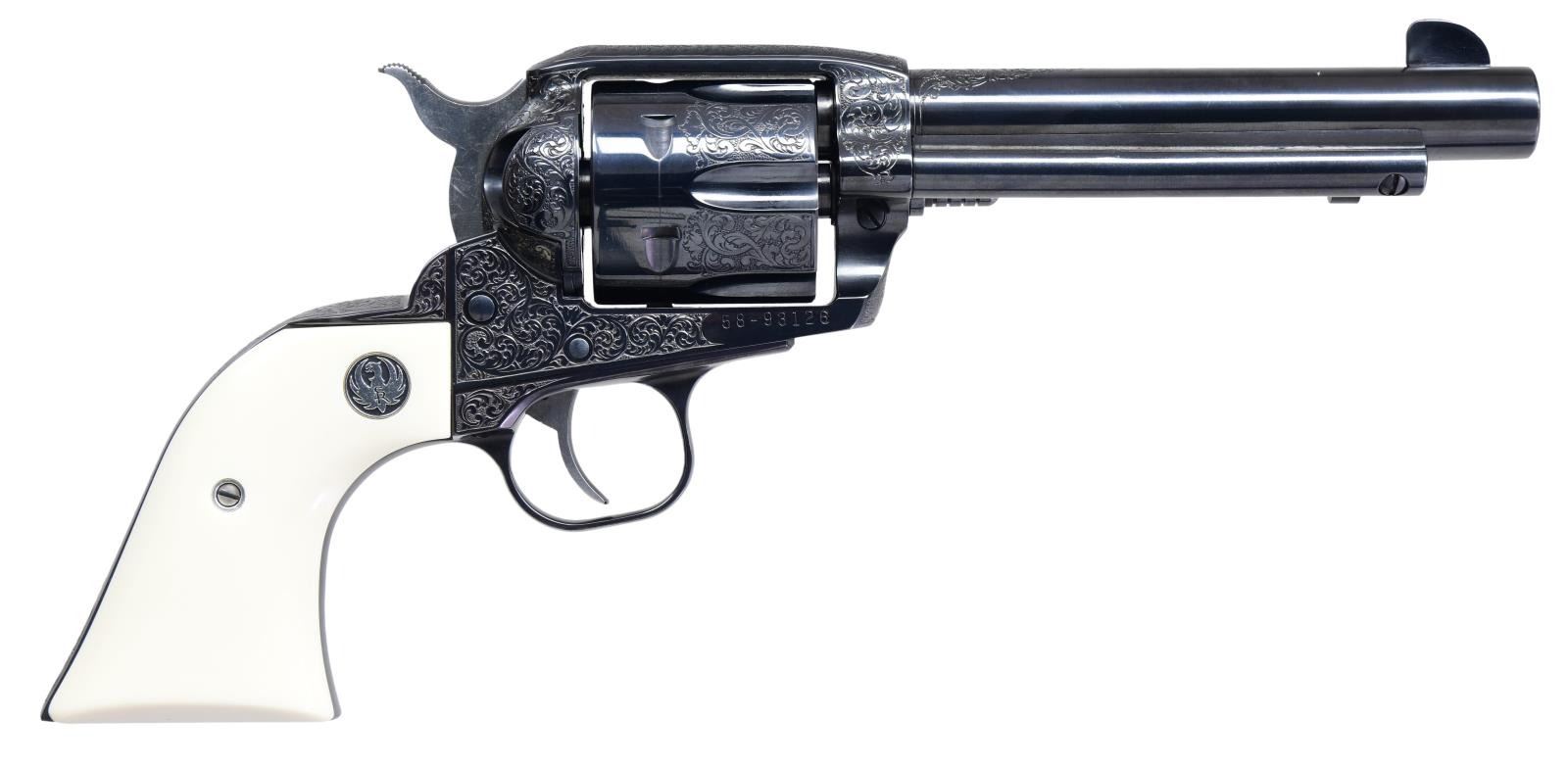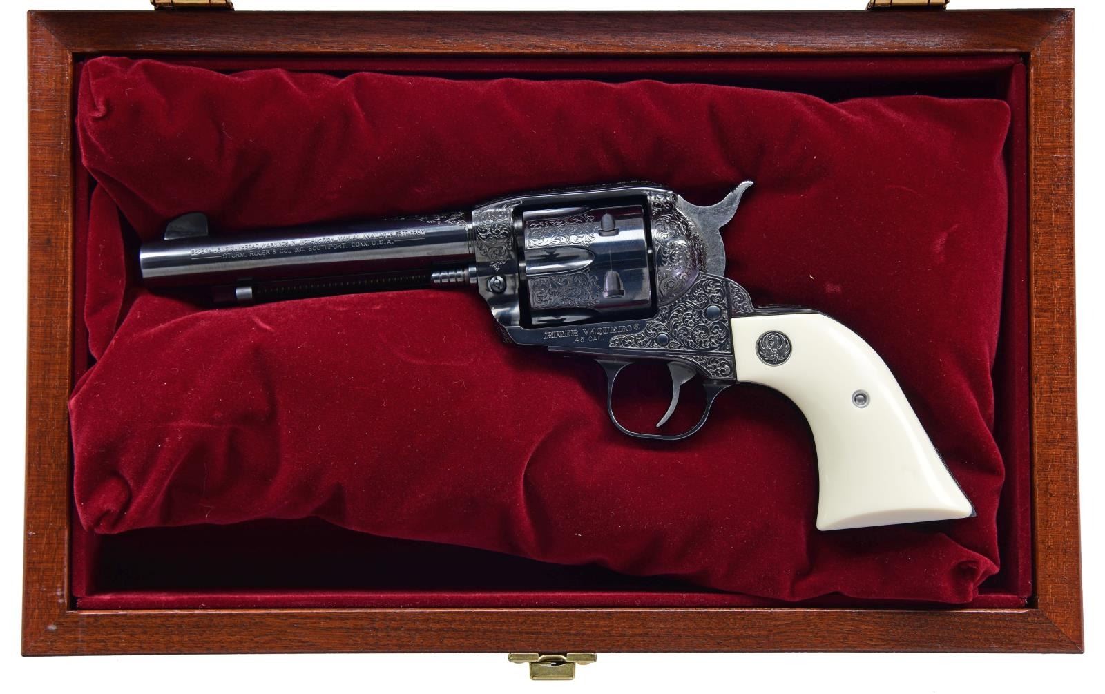 Cal. 45 Colt. S# 58-93126. Bbl. 5 1/2" with blade sight; frame notched rear. Test fired January of 2005 (1993 to approx. 2008; replaced by New Vaquero mfg. 2005 to date) as BNV-455-IE which was engraved by Heidi Roos (later of Baron Technology) who hammer and chisel engraved it at Ruger's Studio of Art & Decoration with Level III Western Scroll; 5 revolvers numbered 58-93125 to 58-93129. This revolver along with two others engraved with Level I and Level II engraving were displayed by Ruger at main gun shows plus they were featured in the 2005 Ruger Catalogue. A revolver like this one (58-93125) is noted in the RENE Reference Guide but as KBNV (stainless designation) rather than BNV; all the levels of Roos engravings were blued revolvers. For its display purposes, it is without its firing pin assembly (for safe handling) which can be corrected by a return to the factory; they will not send the parts as they must be factory fitted. Retained in the factory collection until sold through a Ruger auction to benefit Honored American Veterans Afield. The cost of the Level III engraving in 2005 was approximately $5,800. An unusual facet of the revolver is that it has a XRN-3 grip frame as used on the New Vaqueros; also marked with "W" and "D" plus numbered "126" as is the cylinder. Grips are simulated ivory with silver eagle medallions. Ruger's website lists it as shipped 2011 with Model Number 00550; checking 58-93125 lists the same information but shipped 2005. Serial number 58-93127 has no info (likely retained at factory) plus 58-93128 and 58-93129 were both shipped in 2006. One of only 5 Level III engraved Vaqueros that is the highest grade with special features and factory documentation. Fifteen Level I Vaqueros were numbered 58-93100 to 58-93114 and ten Level II Vaqueros were numbered 58-93115 to 58-93124: total of 30 engraved Vaqueros. UNATTACHED ACCESSORIES: letter of authentication signed by CEO, Michael Fifer plus notice of auction payment received by Ruger of $3,775. Near excellent walnut display case with maroon velvet interior to include plastic bead filled display pillow. Brass hardware, case key plus glass top is satin etched with the Ruger logo and "RUGER Studio". One piece yellow / black box with Ruger applied label on end with only serial number plus outer shipping sleeve. Factory manual plus advertisement copy of the benefit auction. CONDITION: faint cylinder turn line with balance near excellent including bore. (23-6074/NW). MODERN. $2,500-4,000.