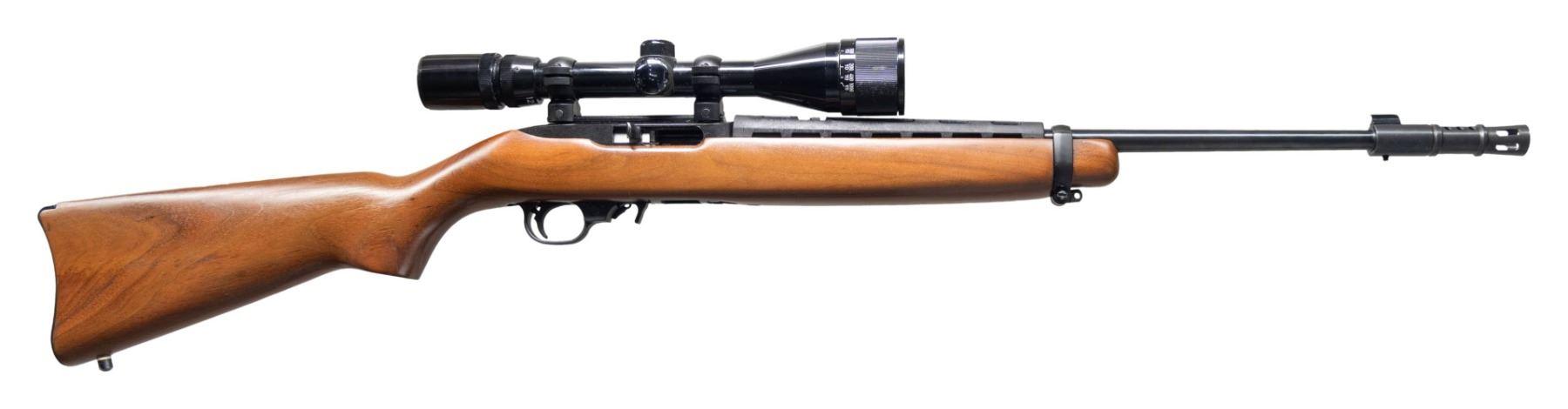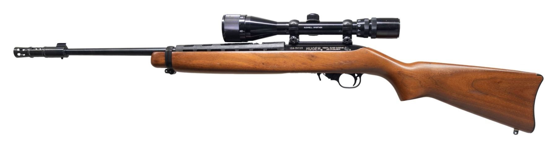 1) RUGER 10/22 SEMI AUTO CARBINE. Cal. 22 LR. S# 114-99119. Bbl. 18" with added flash hider & composite handguard. Standard iron sights. Bushnell Sportview 4-12x duplex, AO scope on Weaver style rings & base. Extended mag. release. Walnut stock w/ aluminum buttplate. CONDITION: very good overall appearance with light handling marks. Very good shiny rifling. Good finish on scope with serviceable optics. (25-4495/MD). MODERN. 2) JAPAN WEATHERBY MARK XXII CLIP FED DUAL ACTION RIFLE. Cal. 22 LR. S# J-31997. Bbl. 24". Sporting sights. Bushnell Scopechief Twenty Two 4x crosshair scope on grooved receiver. Lever on right side of receiver allows the rifle to be semi-auto or single shot. Skip-line checkered Monte Carlo walnut stock w/ rosewood forearm tip & grip cap, black nylon sling on QD swivels & studs, & brown pad. MAGS: 1 - 6 rd. CONDITION: rifle shows significant water damage with heavy deep pitting on both sides of barrel & yellowing of finish on toe of stock alongside blistering finish on sides of forearm. Floorplate has large piece corroded with blistering finish. Very good bore. Scope has very good finish with cloudy optics. (25-4529/MD). MODERN. 3) SAVAGE MODEL 1903 SLIDE ACTION RIFLE. Cal. 22 S, L, LR. S# 58.393. Mfg. 1903-1922. Oct. 24". Blade front sight altered to bead, folding rear sight & peep tang sight. Left side of action has custom wavy line engraving. Walnut stock set with grooved forearm & checkered pistol grip buttstock. MAGS: 1 - 7 rd. CONDITION: metal has gray/brown patina appearance with marks, spots of corrosion & pitting. Worn wood finish with handling marks. Poor rifling with pitting. (25-4530/MD). CURIO. $400-700