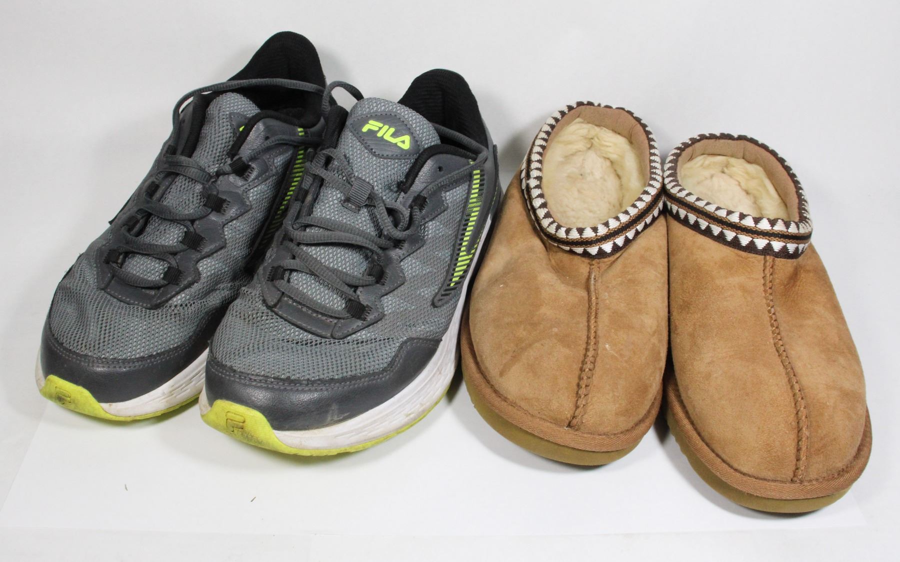 FILA RUNNING SHOES SIZE 9 MENS. PAIR OF WARM UNISEX SLIPPERS SIZE 8 MENS OR 9 WOMENS.