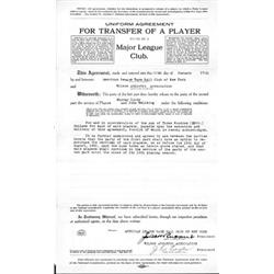 (1867 - 1939) American brewery owner most remembered for his ownership of the fledgling New York Yankees. Partly-printed D.S. as President of the New York Yankees [American League Base Ball Club of New York], 1p. legal folio, [New York], Jan. 29, 1921 in which Ruppert agrees to release two players, Murray Lindy and John Wellsing for the sum of $300 per player to the Wilson Athletic Association with the proviso that Yankees have the option to repurchase the players' services before the 15th of August, 1921. Very good condition.