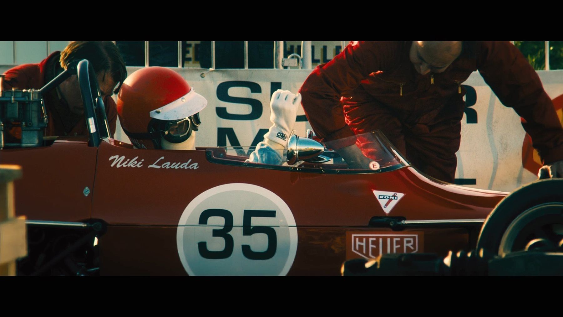 RUSH (2013) - Niki Lauda's (Daniel Brühl) and James Hunt's (Chris Hemsworth) Formula 3 Balaclava and