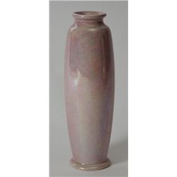 Keramik. Weißer Scherben mit rosa-perlmuttfarbener Eosinglasur. Schlanke hohe, schwach bauchige Form auf kleinem Standring, eingezogene Schulter, ausgestellter Mündungsrand. H.: 16 cm. Bez.: Firmenmarke mit Jahreszahl (Blindstempel) und Zusatz 38 B (gemalt). 1920
