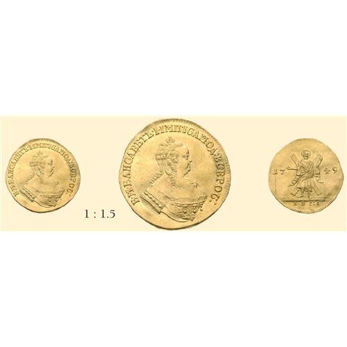 Ducat 1749 (3.51 g), Moscow. Bust right / Saint Andrew, date ABG:1 below. Friedberg 111.