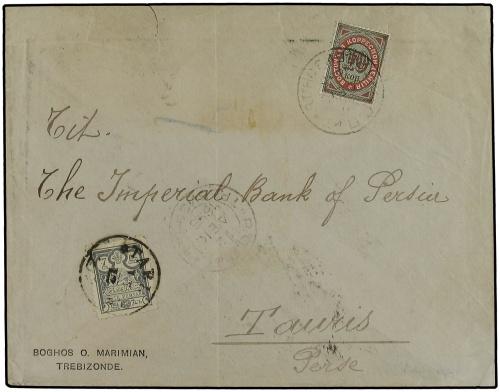 1895 Cover to PERSIA, franked with 10 kop red and green (Mi 9b), tied by R.O.P.I.T./TREBIZOND datestamp, with additional strike alongside. Front shows Iran 7 ch. grey applied on arrival and tied by TABRIZ cds, while reverse bears BATUM and TILFIS transits. A fantastic combination cover. Ex Lipschutz.