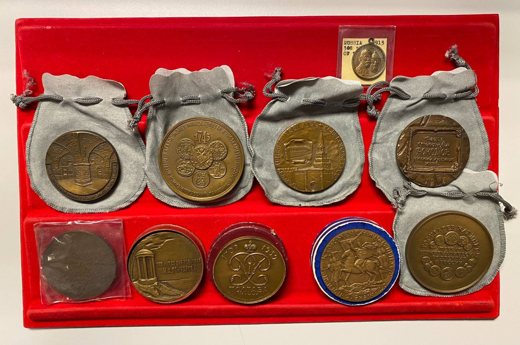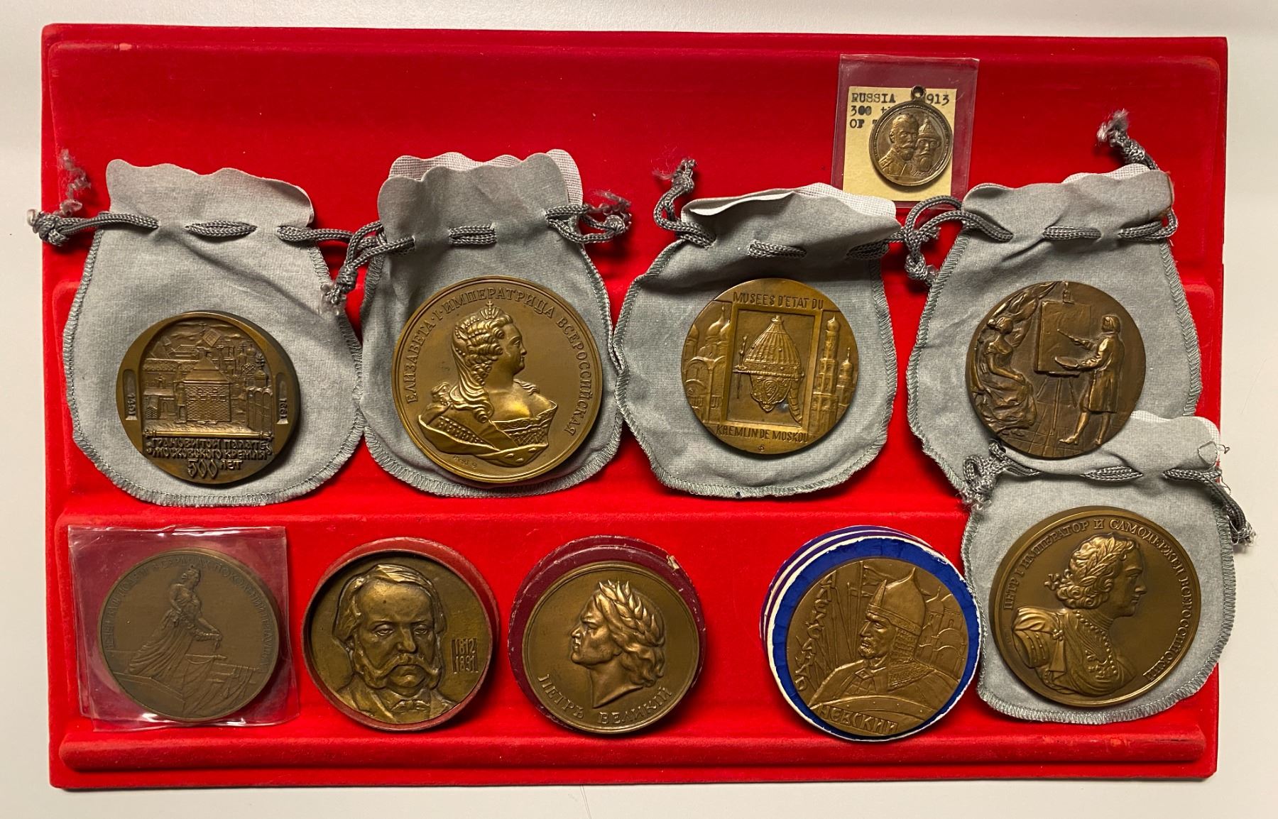 RUSSIA: LOT of 10 medals, including Empire: 1913 silvered AE 28mm 300th Anniversary of Czarist Rule; and USSR: ND (1988) AE 60mm Defenders of Leningrad, 1959 AE 58mm 250th Anniversary of the Victory at Poltava (in Paris Mint box), 1987 AE 60mm 175th Anniversary of Birth of Writer I. A. Goncharov (in Paris Mint box without lid), ND (1966) AE 61mm 725th Anniversary of the Battle on the Ice/Alexander Nevsky (in mint box), 1991 AE 58mm 500th Anniversary of the Kremlin Faceted Chamber (in cloth pouch), 1993 AE 70mm Publication of Kunstkamera Munzcabinet Coins (in cloth pouch), 1991 AE 71mm Peter the Great First Numismatic Collection in Russia (in cloth pouch), 1989 AE 60mm 250th Anniversary of the Birth of F.S. Rokotov (in cloth pouch), and ND (1976) AE 60mm State Museums of the Kremlin (in cloth pouch, obverse spot); all unc except for the 1913 piece (EF), in consignor's holders and original packaging, viewing recommended; retail value $425, lot of 10 pieces.