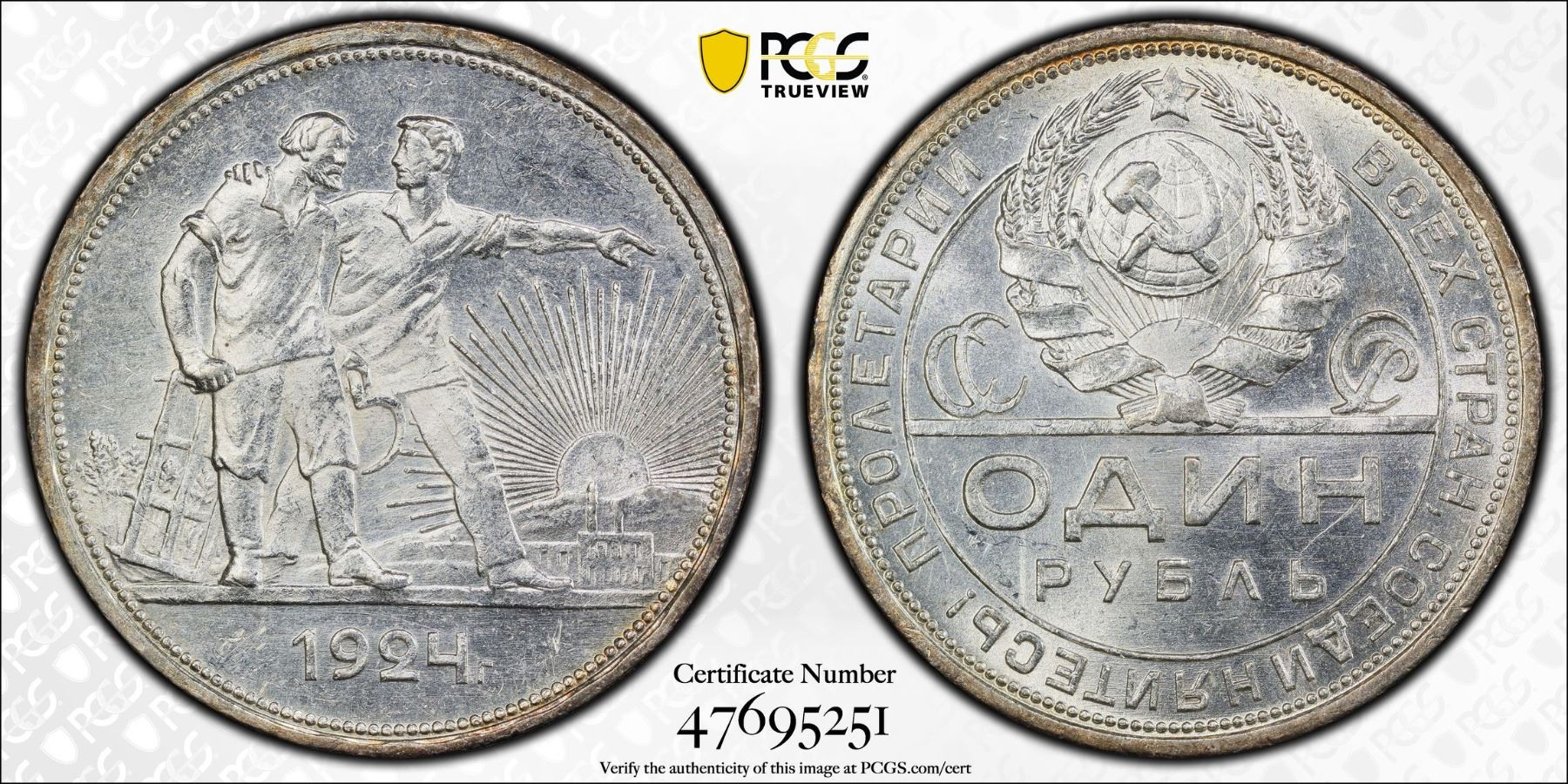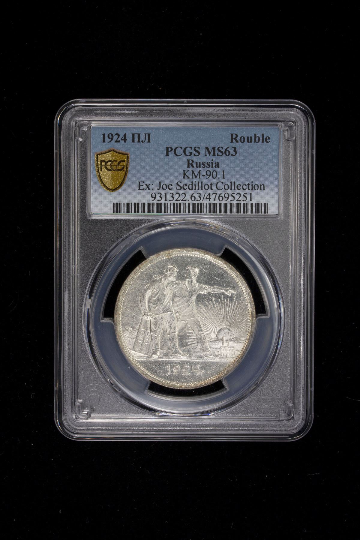 RUSSIA: S.F.S.R.: AR rouble, 1924, Y-90.1, Worker rouble, a lovely example! PCGS graded MS63, ex Joe Sedillot Collection.