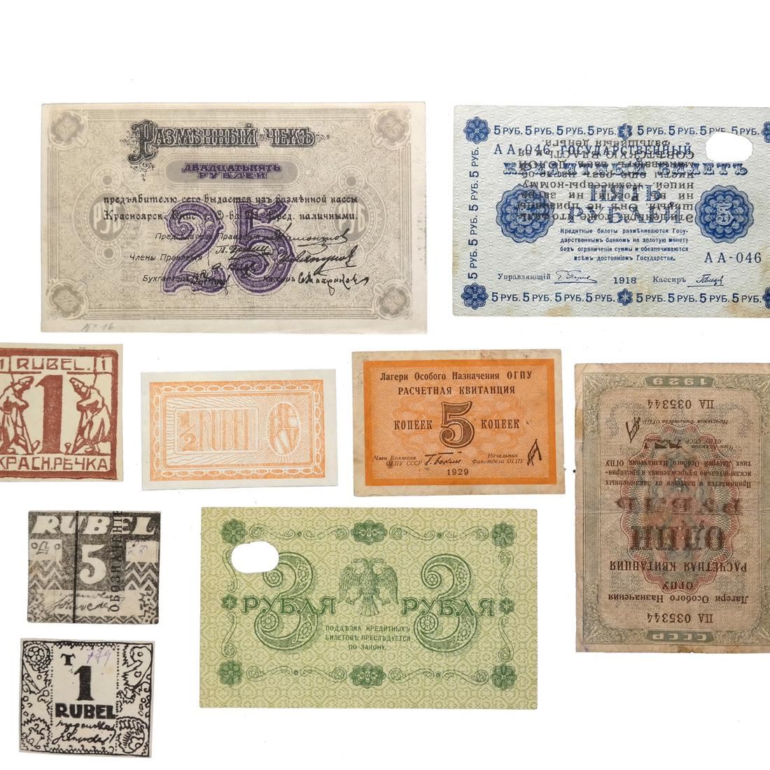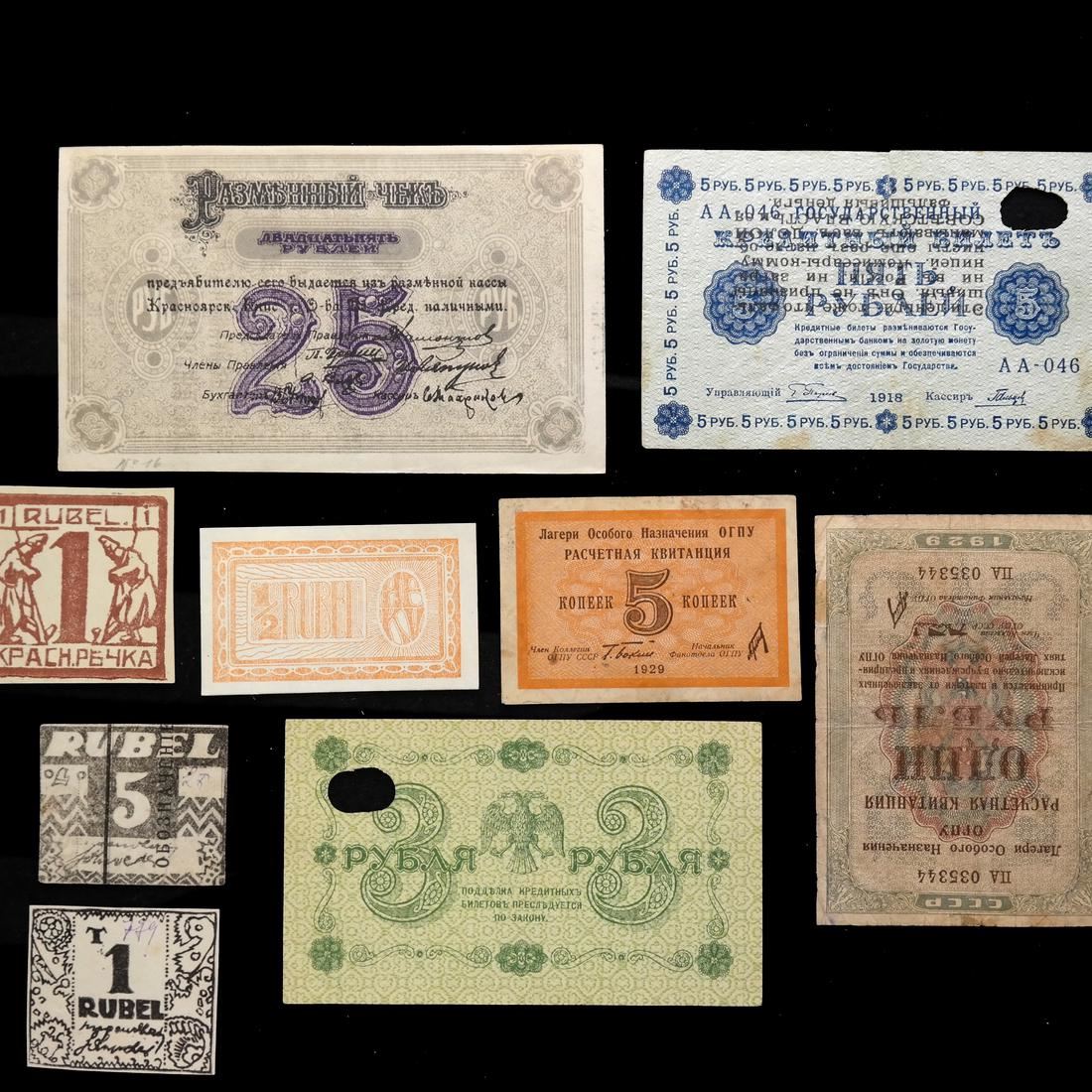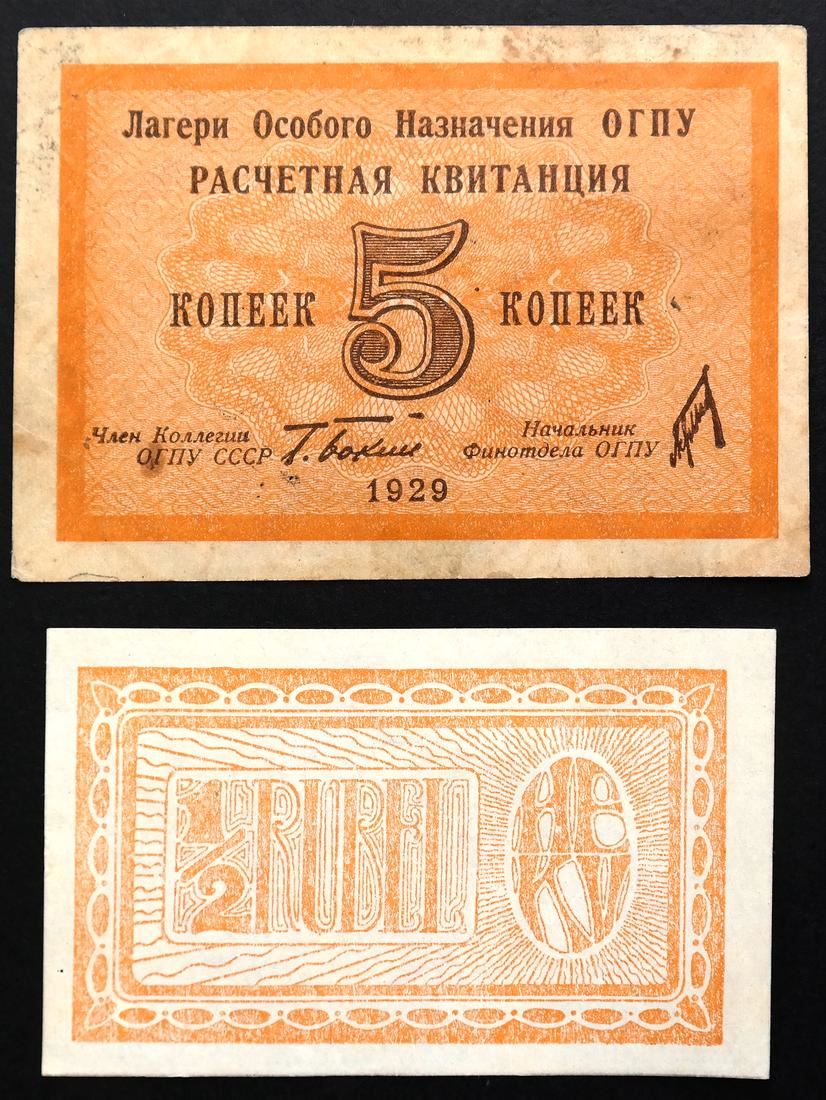 Includes World War I prisoner of war camp scrip and Soviet labor (GULAG) camp notes, mixed condition.
