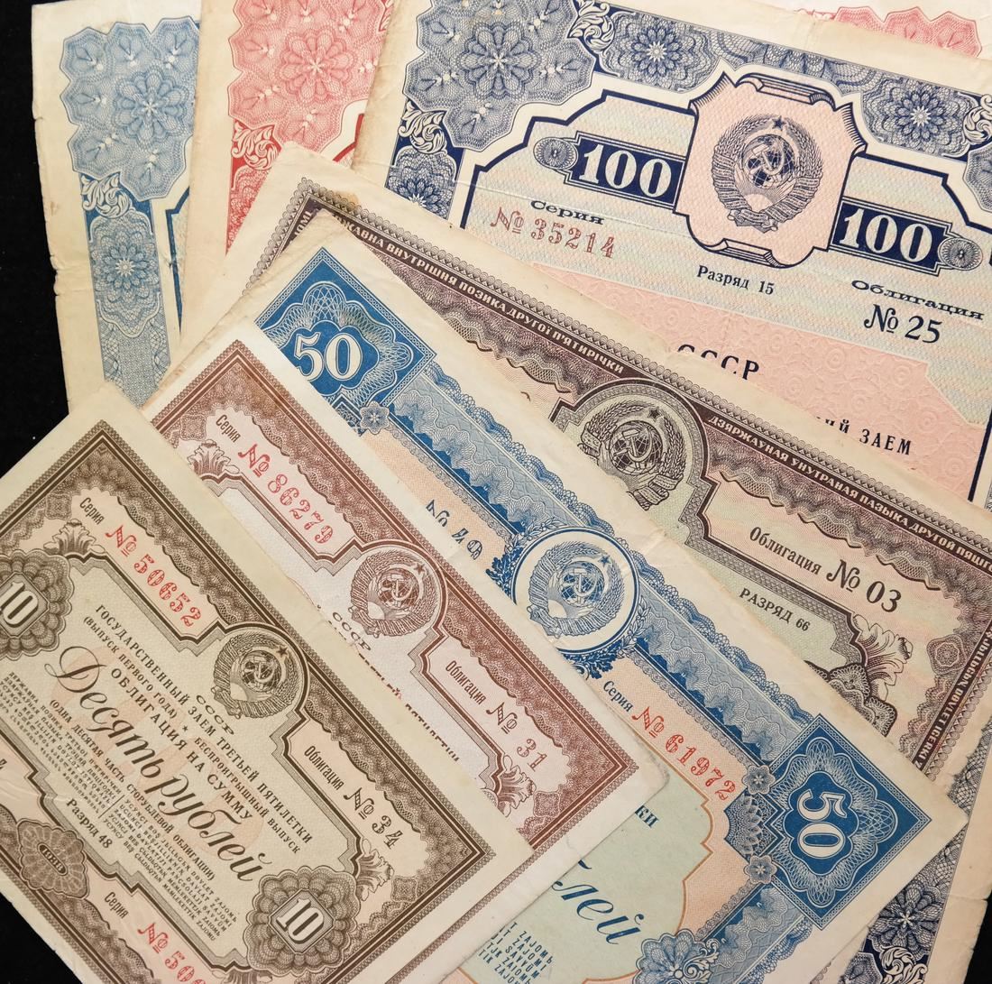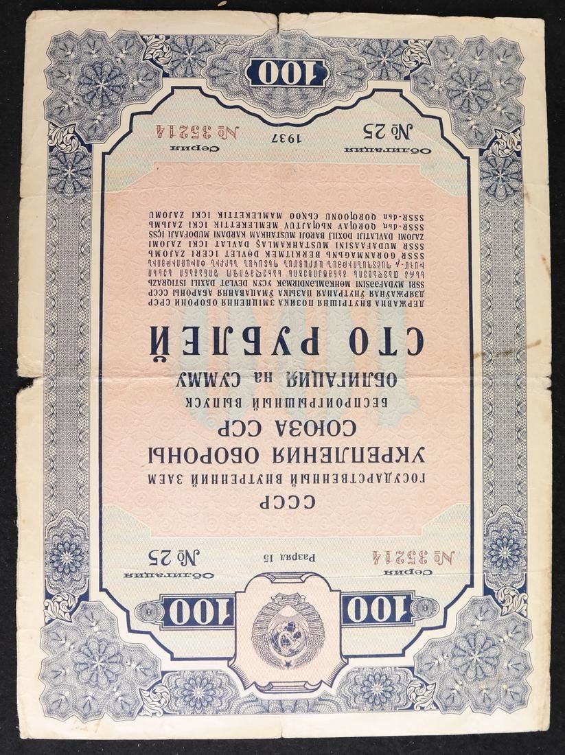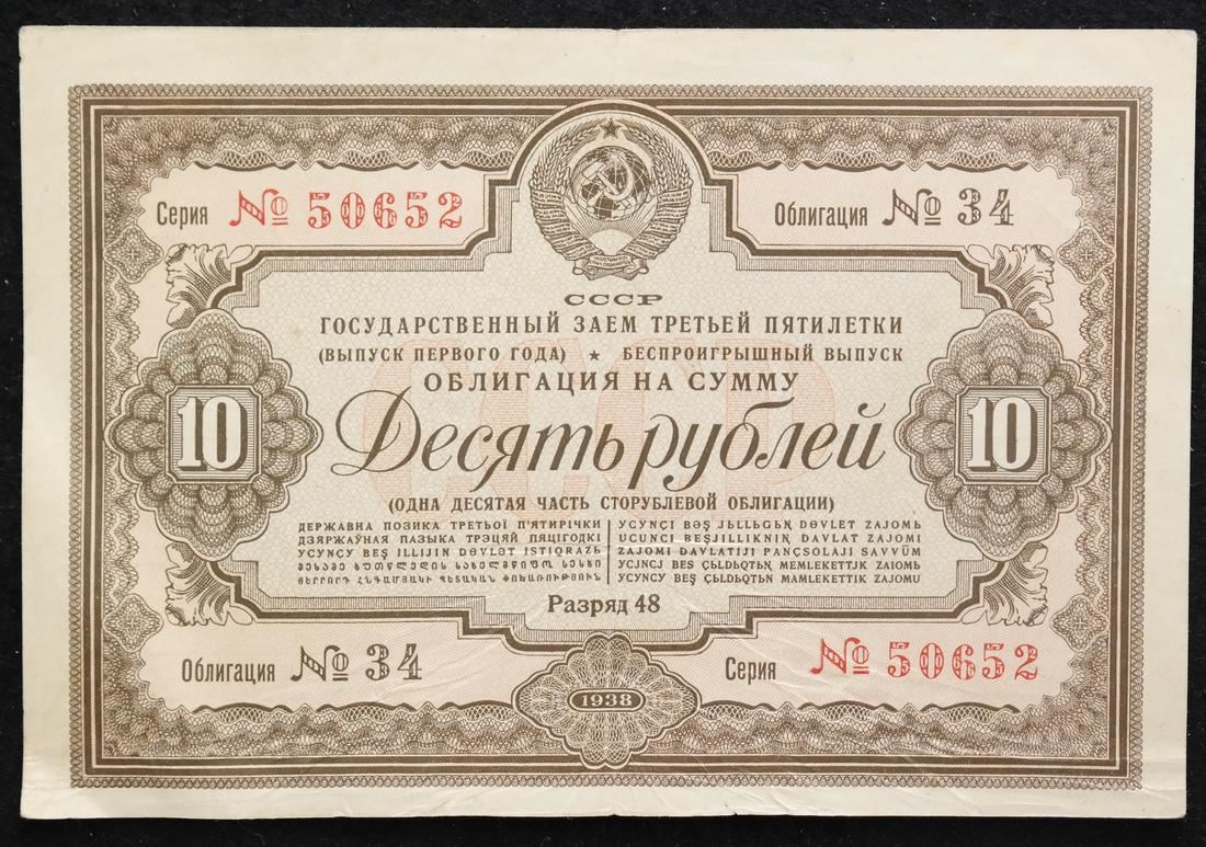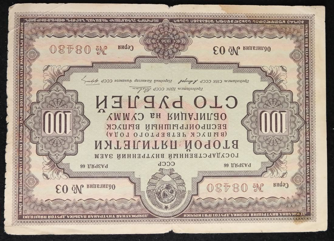 Includes 1938 10R, 1940 25R, 1939 50R, 1936 100R, 1937 100R, 1938 100R and 1939 100R state bonds, mixed condition but generally sound and F-VF.