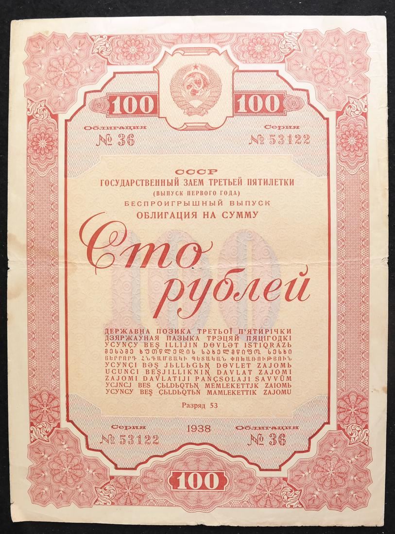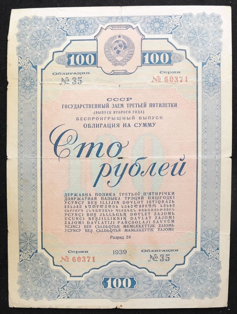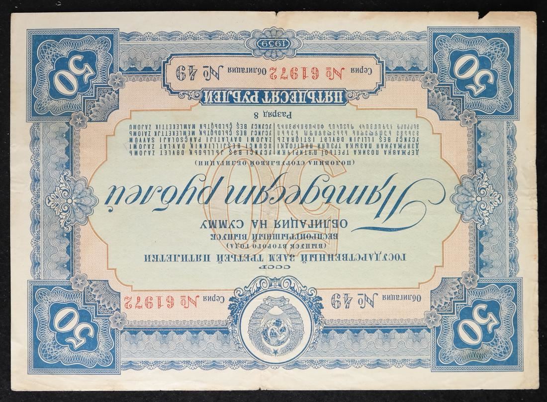 Includes 1938 10R, 1940 25R, 1939 50R, 1936 100R, 1937 100R, 1938 100R and 1939 100R state bonds, mixed condition but generally sound and F-VF.