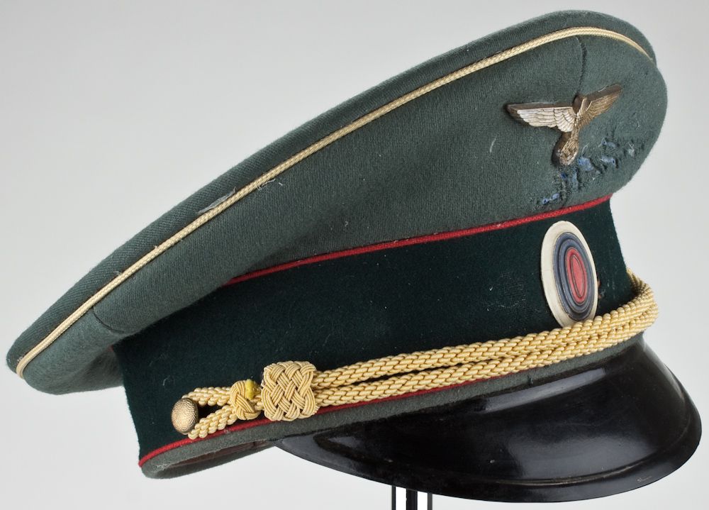 Excessively rare Russian Army of Liberation ("Vlasov Army") green wool visor cap, gold piping at brim with ends fitting perfectly, red piping about the top and bottom of the darker green side panel, gold color braided chinstrap, and a Russian cockade at front with German eagle insignia pinned above. Lined in burgundy cotton and untouched, celluloid liner protector intact and in good condition, pins from insignia appear to have never been moved or re-bent. Brown leather perforated sweatband is likewise in good condition, but could use some cleaning to remove old mold stains. Apparently a recent trunk find with moth damage at front and remains of that attack still evident, insignificant mothing at one small spot on top of cap. A rarer cap, as most of these caps (and their owners) failed to survive the war.