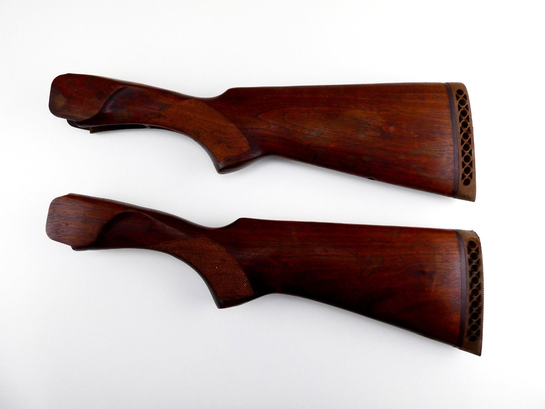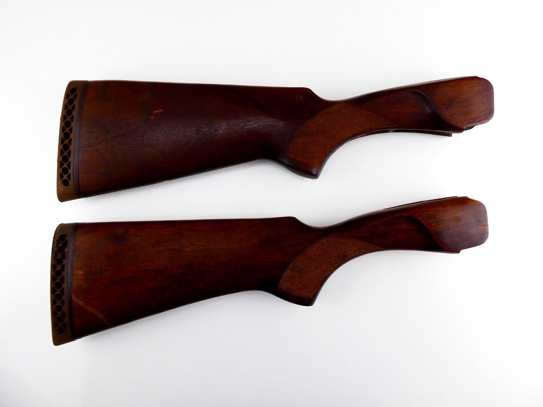 LOT INCLUDES; (2) WOODEN BUTT STOCKS, CHECKERED, PISTOL GRIP, BROWN RUBBER RECOIL PAD, ONE CRACKED THROUGH WRIST / MAY HAVE SMALL CRACKS & CHIPS, OAL APPROX. 17". MAY REQUIRE FITTING. SEE PHOTOS.