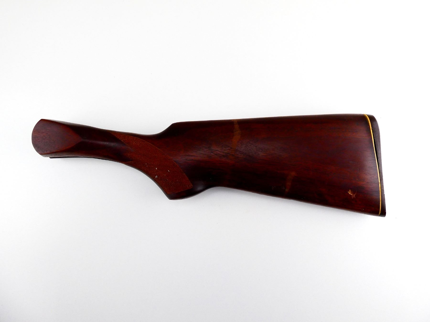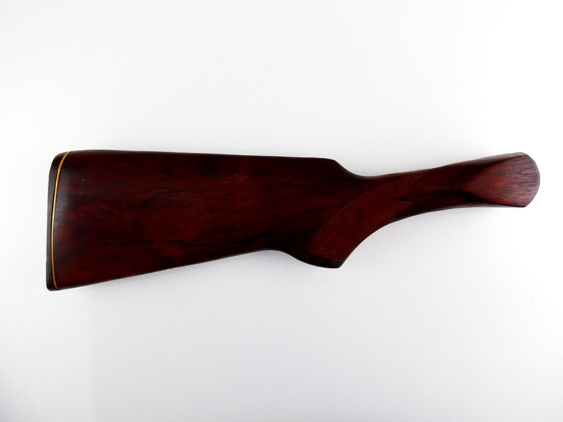(1) WOODEN BUTT STOCK, CHECKERED, PISTOL GRIP, BROWN POLYMER BUTT PLATE, OAL APPROX. 15.75". MAY REQUIRE FITTING. SEE PHOTOS.