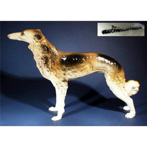 If you are REALLY interested in this item, please note that for Ebay Live Auction only bids at or above $130 will be successful and meet our reserve. Beautiful Art pottery figurine of a Russian Borzoi from the pre WWII era. Well modeled three dimensional effect of the raised hair, air brush hand painted in black, gray and light brown. Very good condition except a small nick on his ear and front paw. Impressive size : 14-1/4" diagonally long x 8-1/4"H. Underglaze "signature" Made in Czechoslovakia, circa 1930's. In some cases photos in Ebay Live Auctions are reduced, so if you want to see larger, more detailed photo, please email us (