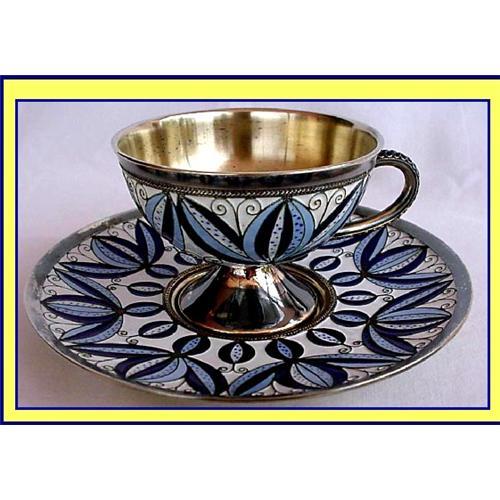 Blue and white cloisonne enamel and silver filigree on 916 (similar to sterling) silver, washed with gold. Made Russia, 20th century.<BR>Weight 11.7oz. Diameter of saucer is 5 7/8inches. Height of cup is 2 1/2inches.<BR>Cloisonne enamel with the cells surrounded by filigree silver borders. All done in traditional white, dark and light blue with contrasting dotted decoration. Stylised flowers and scrolls.<BR>Marked on both pieces with maker's mark (possible letters equivalent to G A Yu), and Russian silver mark for 916 standard, similar to sterling. Silver has been gilt washed. <BR>Condition: enamel is in excellent condition. No losses/flaws. No dents/scratches to silver. The underneath of the saucer was extremely dirty when I got it and some of the gilt wash seems <BR><BR>to have come off as a result. This only affects the underneath of the saucer - see photo. The rest is in very good condition.