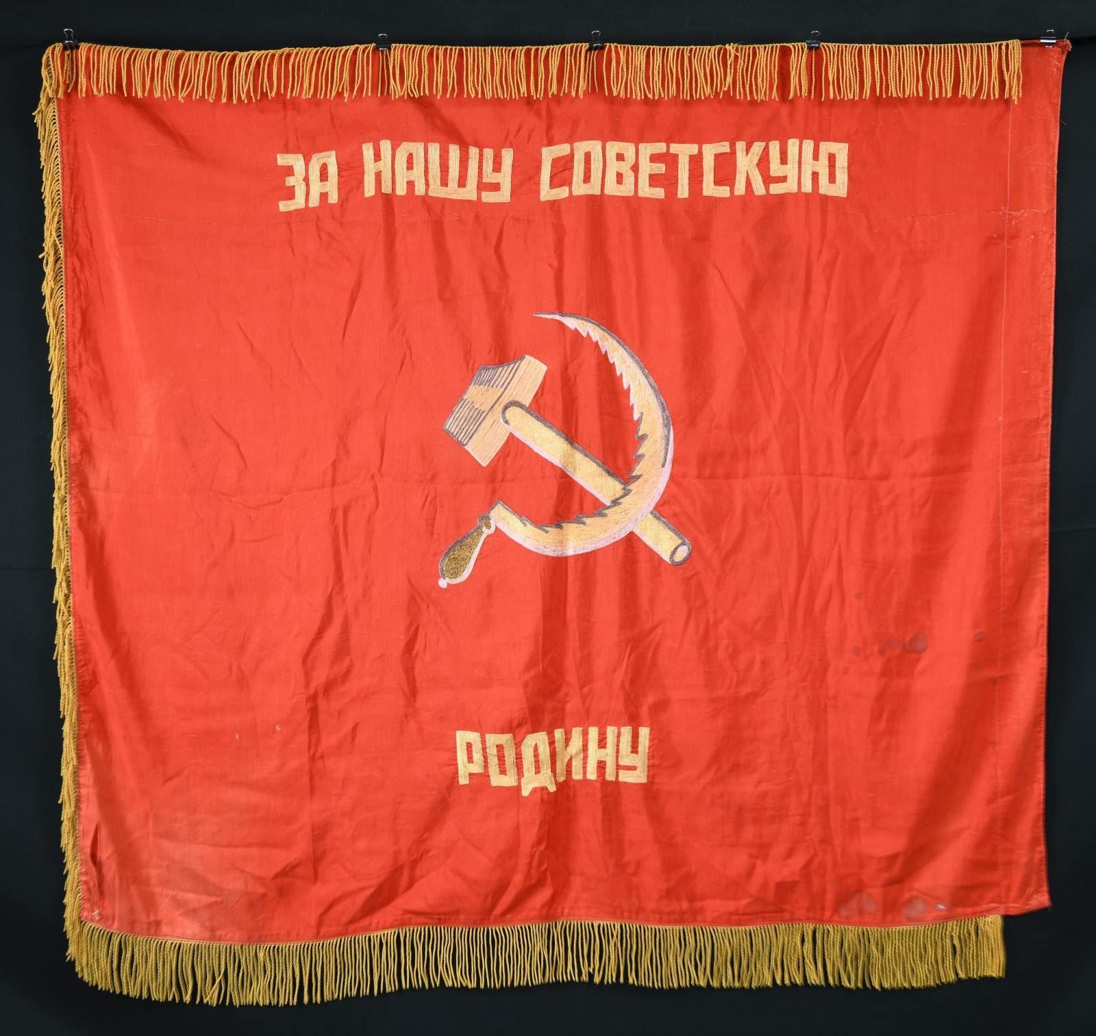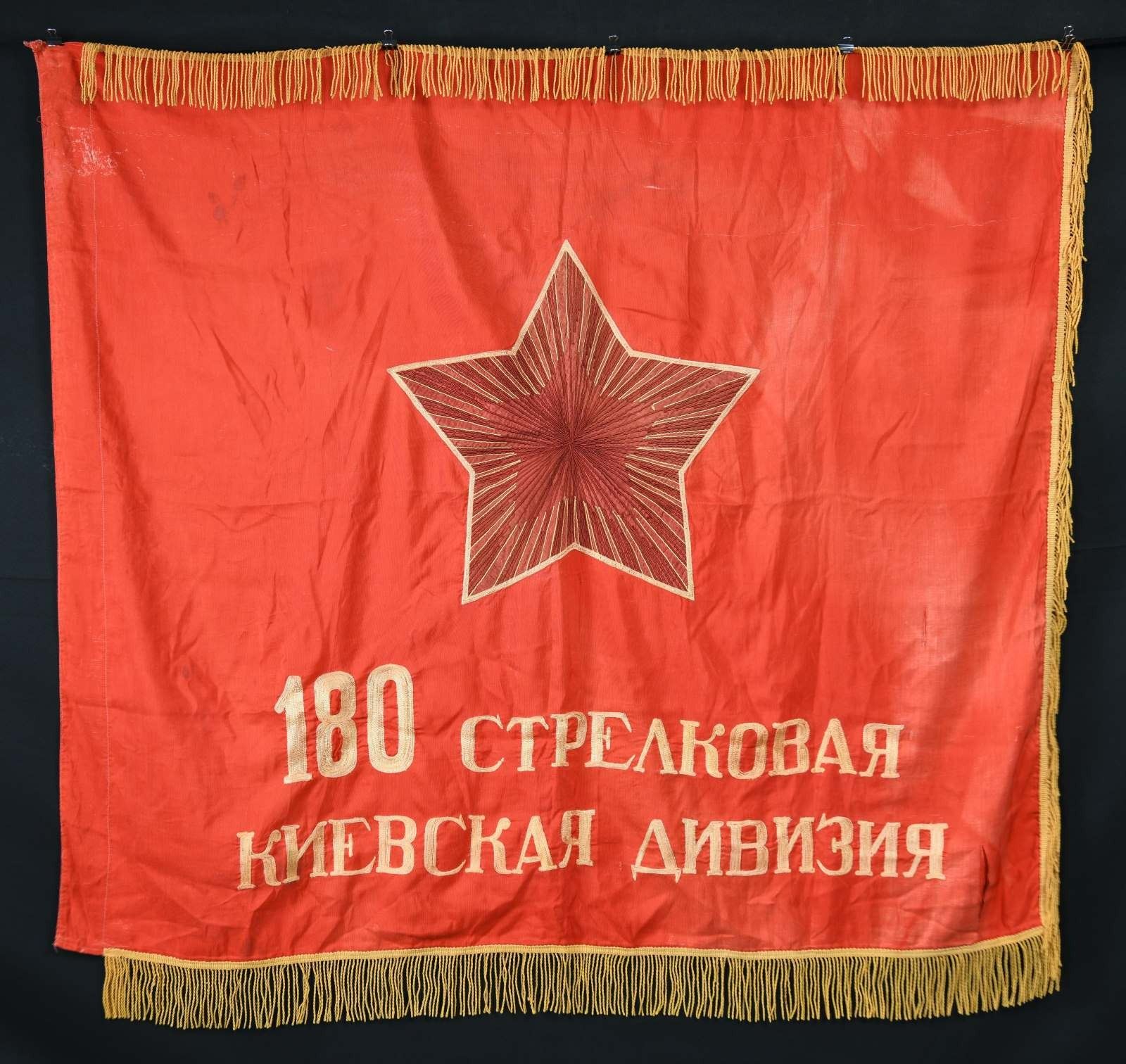 KIEV" DIVISION. 42" x 48" double sided direct applique unit marking of now Ukrainian Russian text flag with patriotic motto on reverse "Our Homeland". CONDITION: good overall, double panels sewn together, staining and several tears and soiling unaffecting overall aesthetic. (02-19473-68/JS). $200-400.