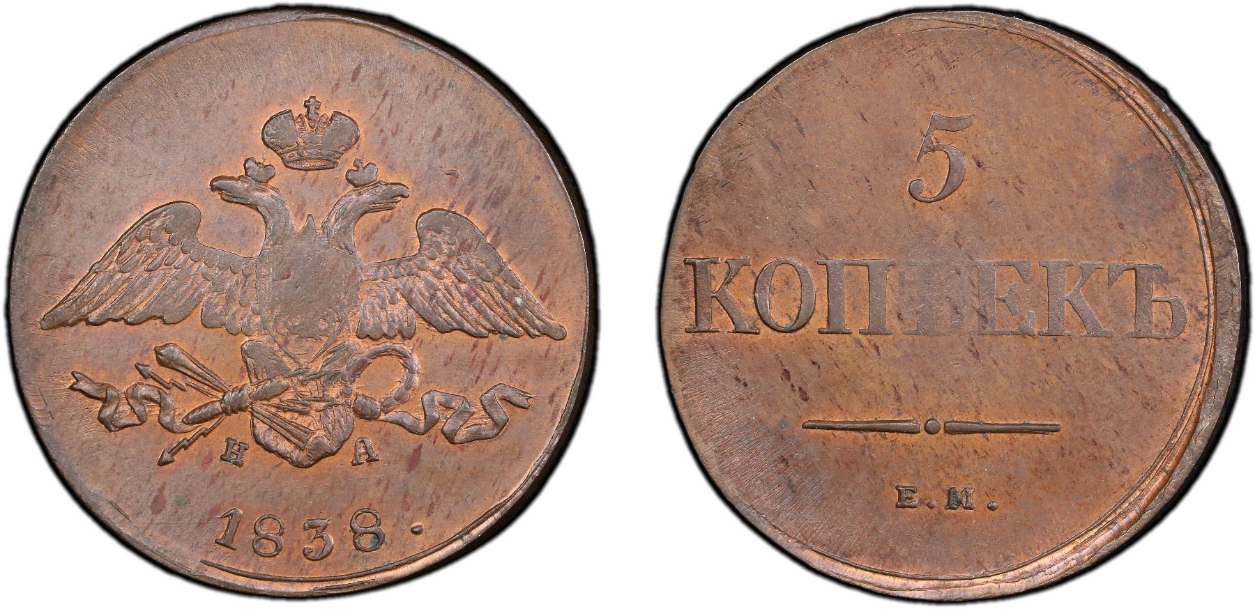 RUSSIAN EMPIRE: Nicholas I, 1825-1855, AE 5 kopeks, 1838, PCGS MS62 BN