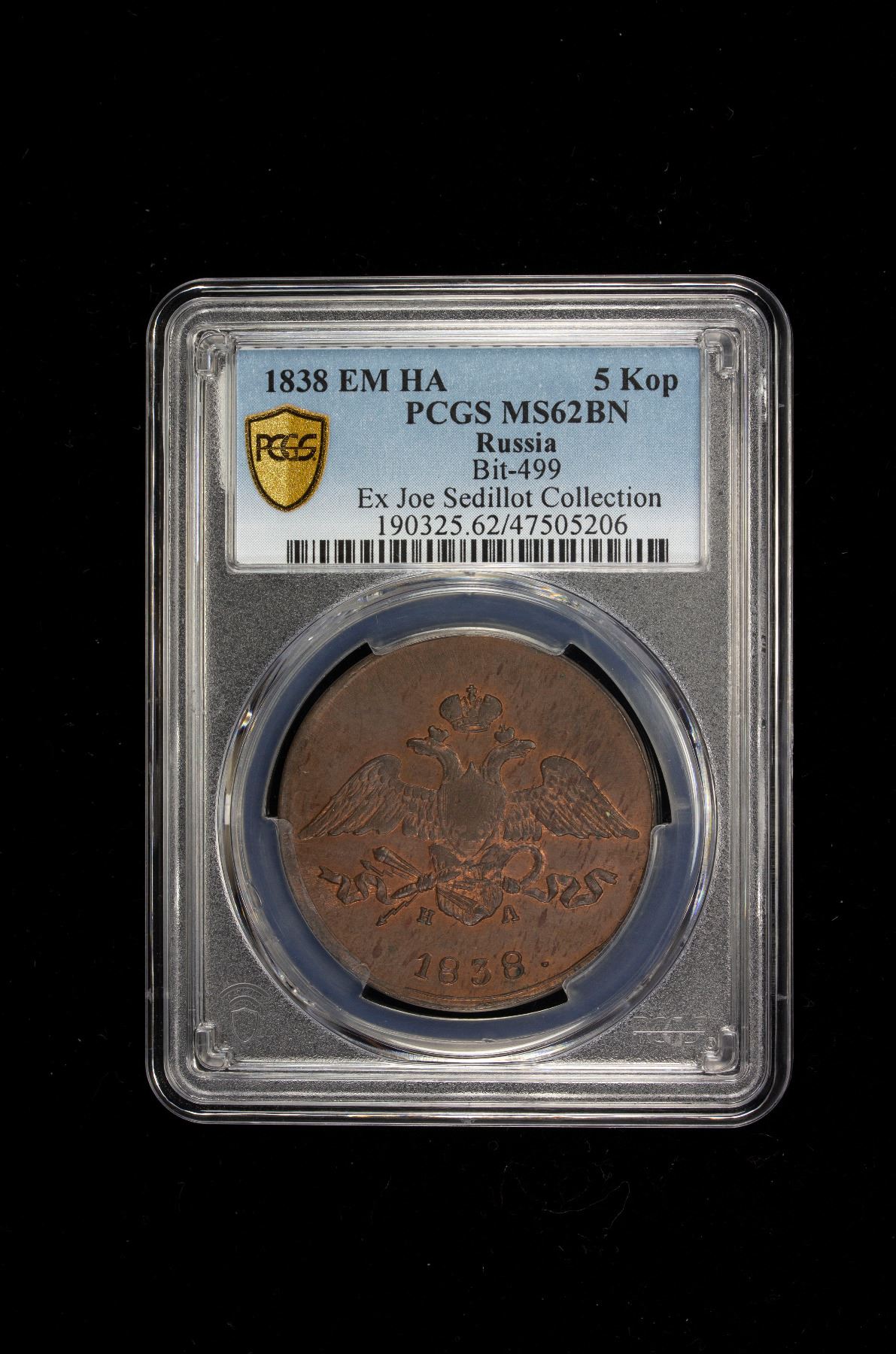 RUSSIAN EMPIRE: Nicholas I, 1825-1855, AE 5 kopeks, 1838, Cr-140.1, Bit-499, Ekaterinburg Mint, Nikolai Alekseev assayer, an attractive mint state example with partial original red mint luster! PCGS graded MS62 BN, ex Joe Sedillot Collection.