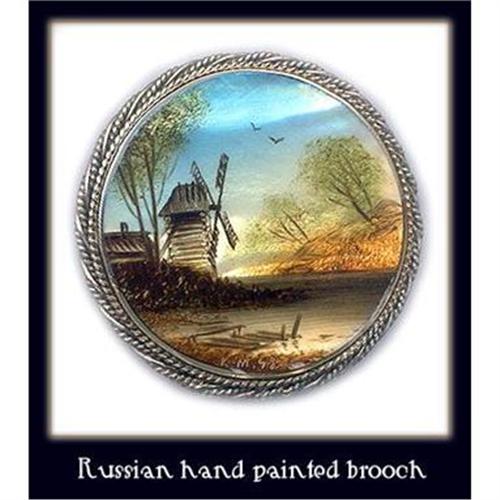 If you are REALLY interested in this item, please note that for Ebay Live Auction only bids at or above $90 will be successful and meet our reserve. Exquisite Russian hand painted brooch depicting scenery with windmill, lake, trees and farmhouse in the background. The scene is painted with translucent paint on Mother of Pearl, so it's light iridescence hue is adding to it's attractiveness. It is extremely difficult to capture the beauty of this miniature Art piece, which eye so easily perceives.... Set in bezeled metal backed frame, surrounded with silver tone twisted rope trim. Signed and dated in lower right K.M. 98. Dimension approx : 1-5/8" in diameter.
