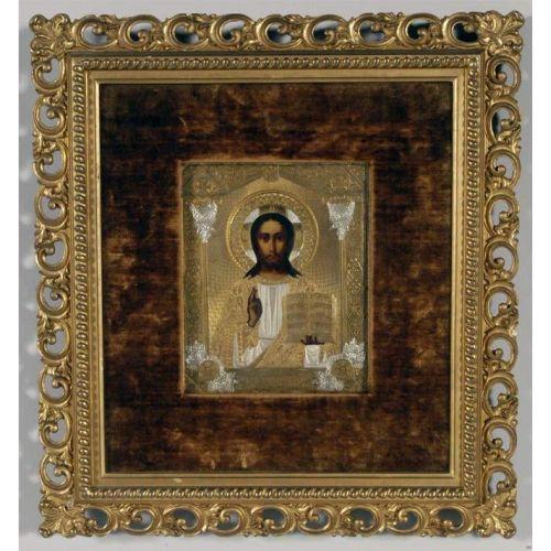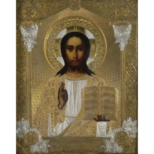 RUSSIAN ICON with gilt silver 7"x 5 3/4" 19th century CONDITION REPORT: no problems. PACKING AND SHIPPING: We offer packing (double boxed in most cases) and shipping of this item within the Continental United States by USPS or UPS (our choice- boxes over 30lbs or oversized may be recalculated based on buyer's location), NOT INCLUDING INSURANCE (it will be added when we know the sales price) for $30