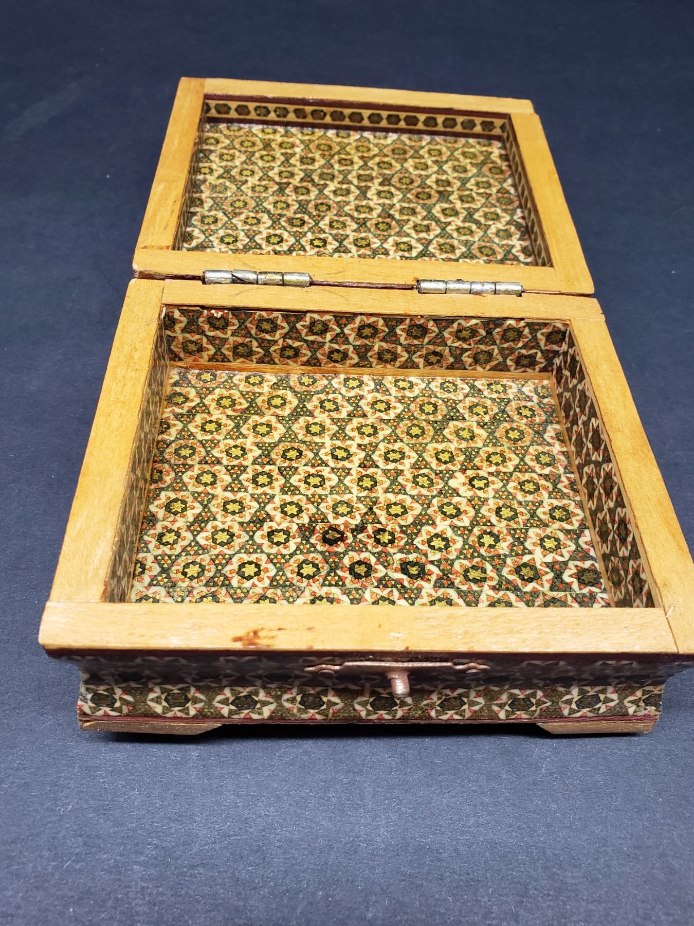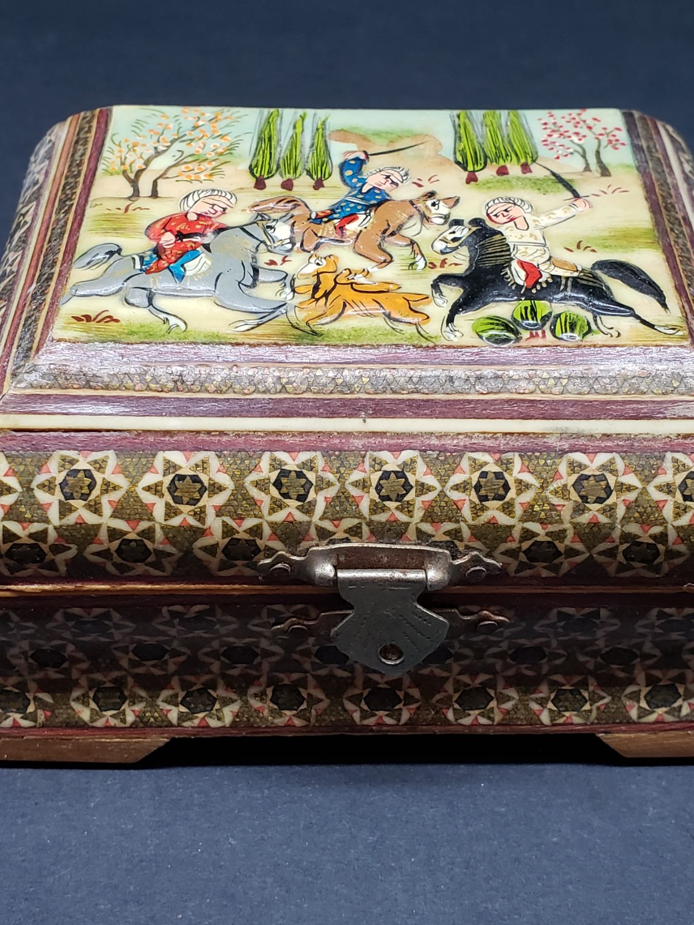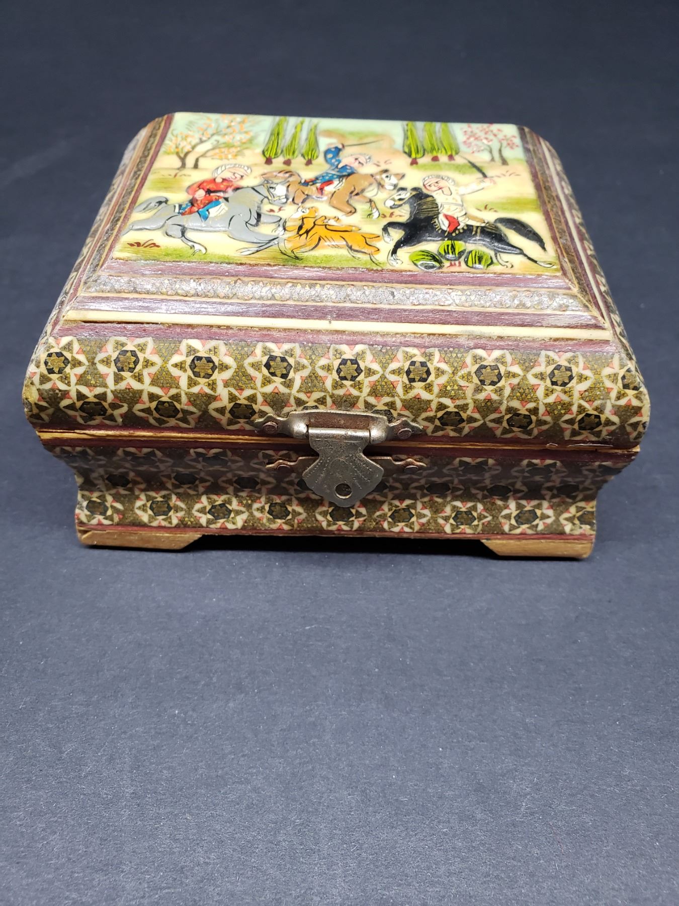Russian inlaid Box Piece is 4 1/2" x 4 1/4" x 2 1/4" All items Located in in Hollywood Florida Warehouse For Shipping Call today for quote they have item numbers and Pak Mail is available for all your custom packaging and shipping needs. We can package, palletize, crate, insure and ship to any Domestic or International location. All packaging and shipping fees must be paid in full before shipment is released. On international shipments, consignee is responsible for all Duties, Taxes, Customs Clearance or any destination fees that apply. Please visit our website @ www.pakmail.com/us770 for contact information or to get a quote. (Let us know you are a winning bidder from the Puckett auction so we can correctly arrange pick up for your item
