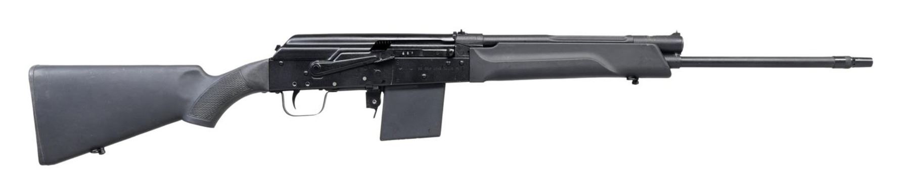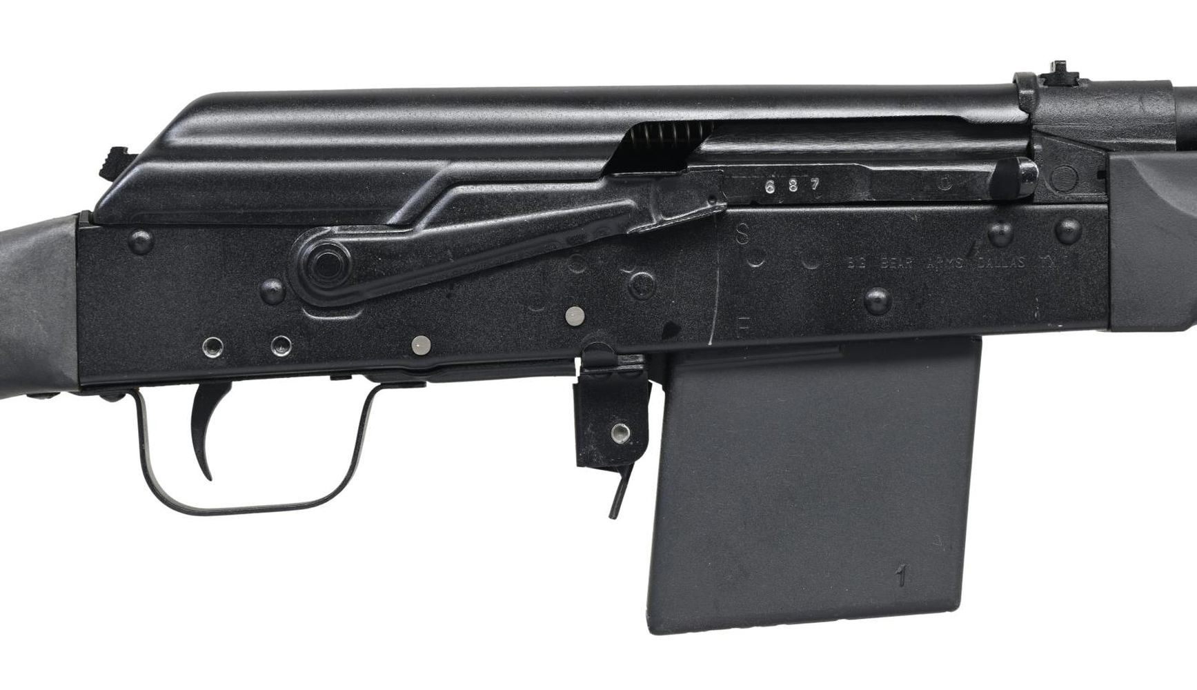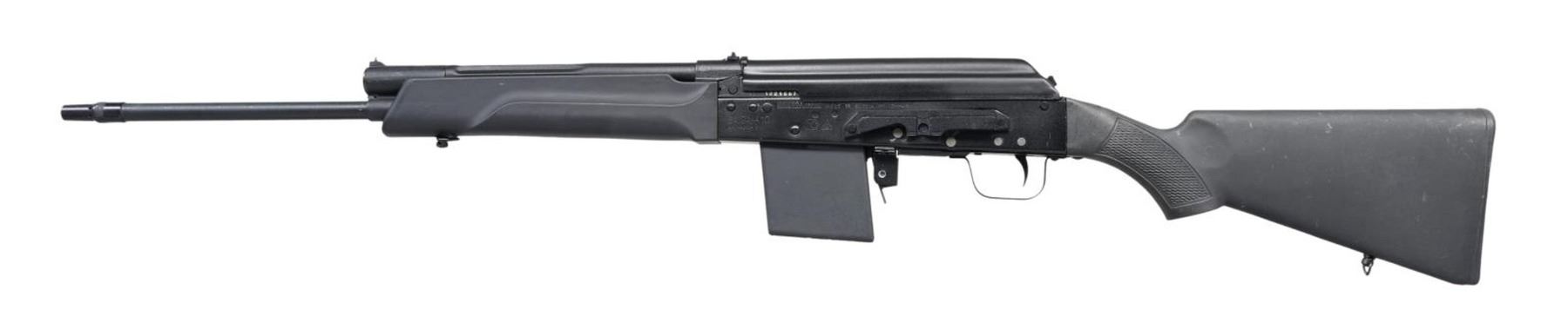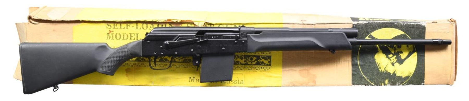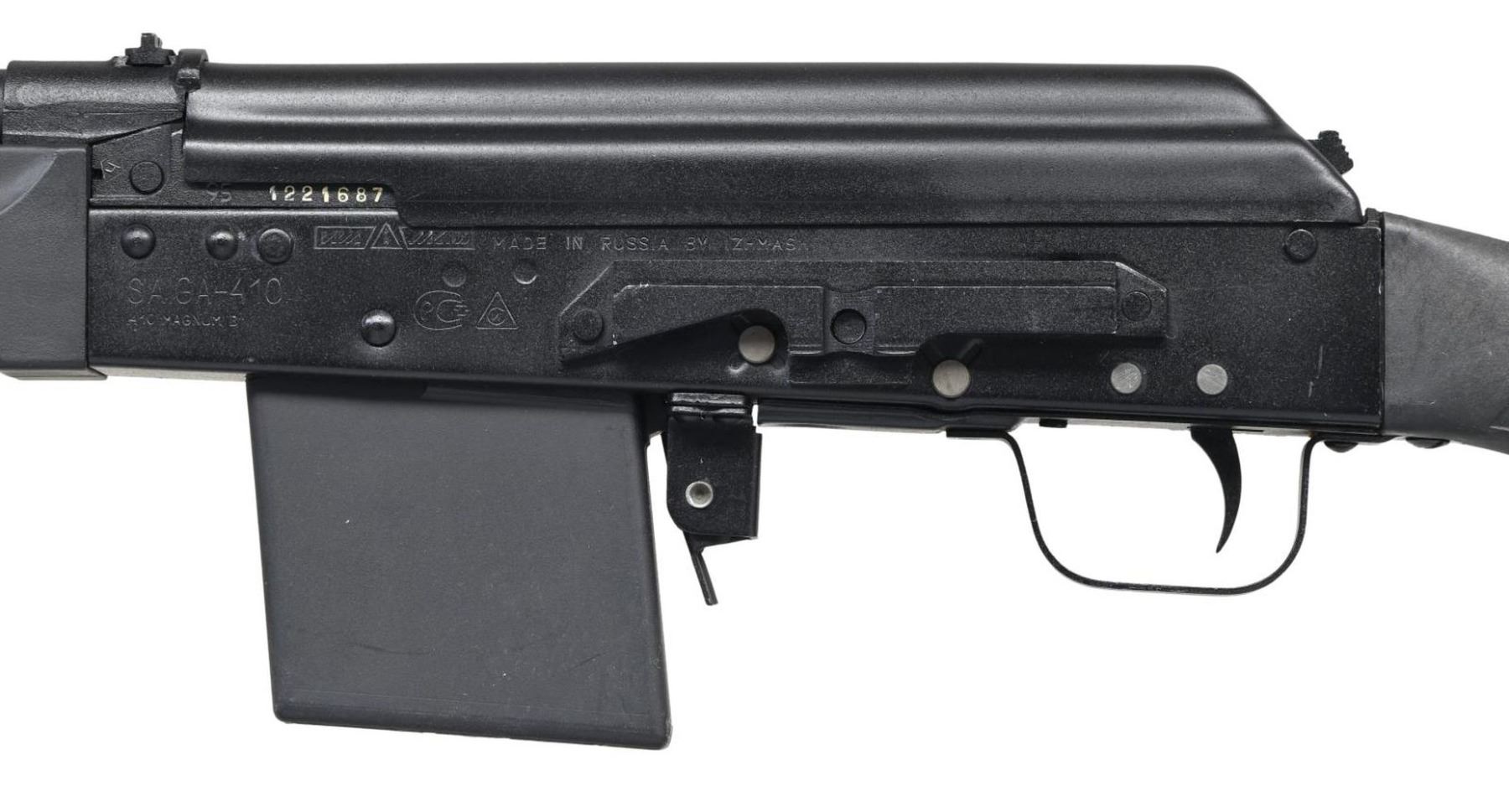 Cal. 410 GA, 3". S# 1221687. Bbl. 20 1/2". Saiga-410 semi-automatic shotgun mfg. in Russia by Izhmash and imported by Big Bear Arms. Left side of receiver is marked "SAIGA-410" above the S#, followed by Russian proofs and "MADE IN RUSSIA BY IZHMASH", with Big Bear Arms' importer information marked on the right. Metal components exhibit a matte black finish. Checkered black polymer pistol grip buttstock with smooth black polymer forend. Brass bead front sight with U-notch rear sight. All numbers are matching and include the receiver, bolt carrier, and bolt. MAGS: 1 4-rd. UNATTACHED ACCESSORIES: importer box containing a cleaning kit. CONDITION: very good, with metal components retaining bountiful amounts of their original factory finish, exhibiting some scattered superficial handling marks, as well as the usual dragline on the right side of the receiver from operation of the safety lever. Mirror bore. Polymer furniture shows scattered superficial marks from handling and storage, but otherwise remain sturdy and serviceable. Box exhibits exterior wear and staining overall. PROVENANCE: From the Working Reference Collection of Military Arms Instructor, Master Sergeant Vincent Pestilli. (23-7580/MLW). MODERN. $400-600.