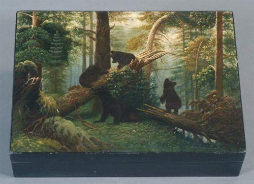 RUSSIAN LACQUERWARE BOX decorated with bears, 10"x 7 1/2" x 2 3/4"