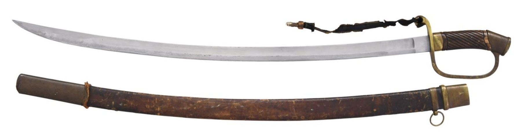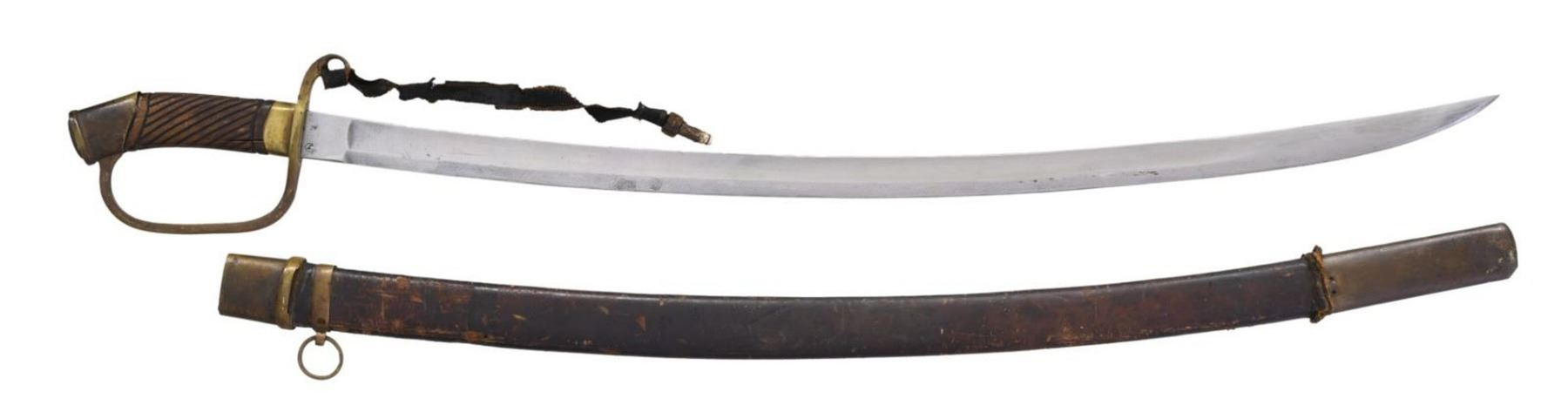 Overall length: 37”. Blade length: 29 1/2". Blade has a single wide fuller, and has a single stamp at the ricasso that appears to be a “J” in a circle. Brass hilt w/ ring quillon & plain knuckle bow. Plain canted pommel w/ diagonally ribbed wooden grip. There is a partial sword knot attached to the quillon. Leather covered scabbard w/ brass mounts. Drag is missing. CONDITION: blade has a pleasing, light gray patina, but has been sharpened. Pommel is a bit loose. Scabbard shows moderate wear. (02-21363/BF). $300-500.