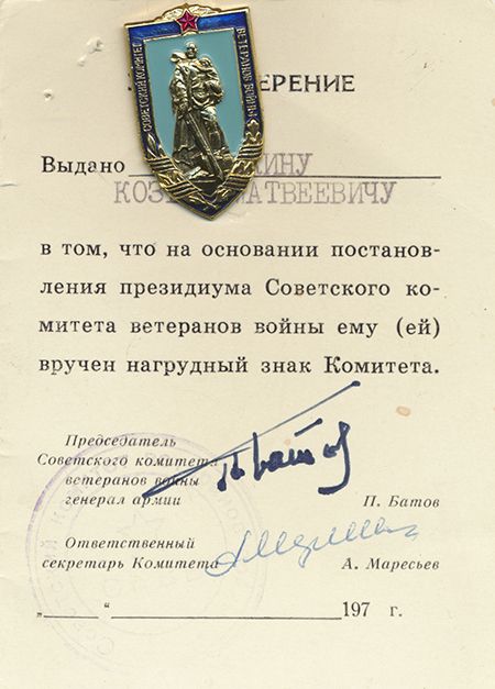 Presentation document, 4pp. 16mo., untranslated but a military presentation of some type with a small pin, boldly signed by PAVEL BATOV (1897-1985) who led the 65th Army during Stalingrad counteroffensive and headed Warsaw Pact troops postwar; also signed by Hero of the Soviet Union, fighter ace ALEXEI MARESYEV (1916-2002) who scored 11 victories, was shot down in winter, breaking both legs. After 18 days of foraging on his hands and knees, he was rescued by partisans and sent to a hospital where both legs were amputated. Undeterred, Maresyev obtained artificial legs, learned to walk and eventually returned to the skies, scoring seven additional victories. Very good.