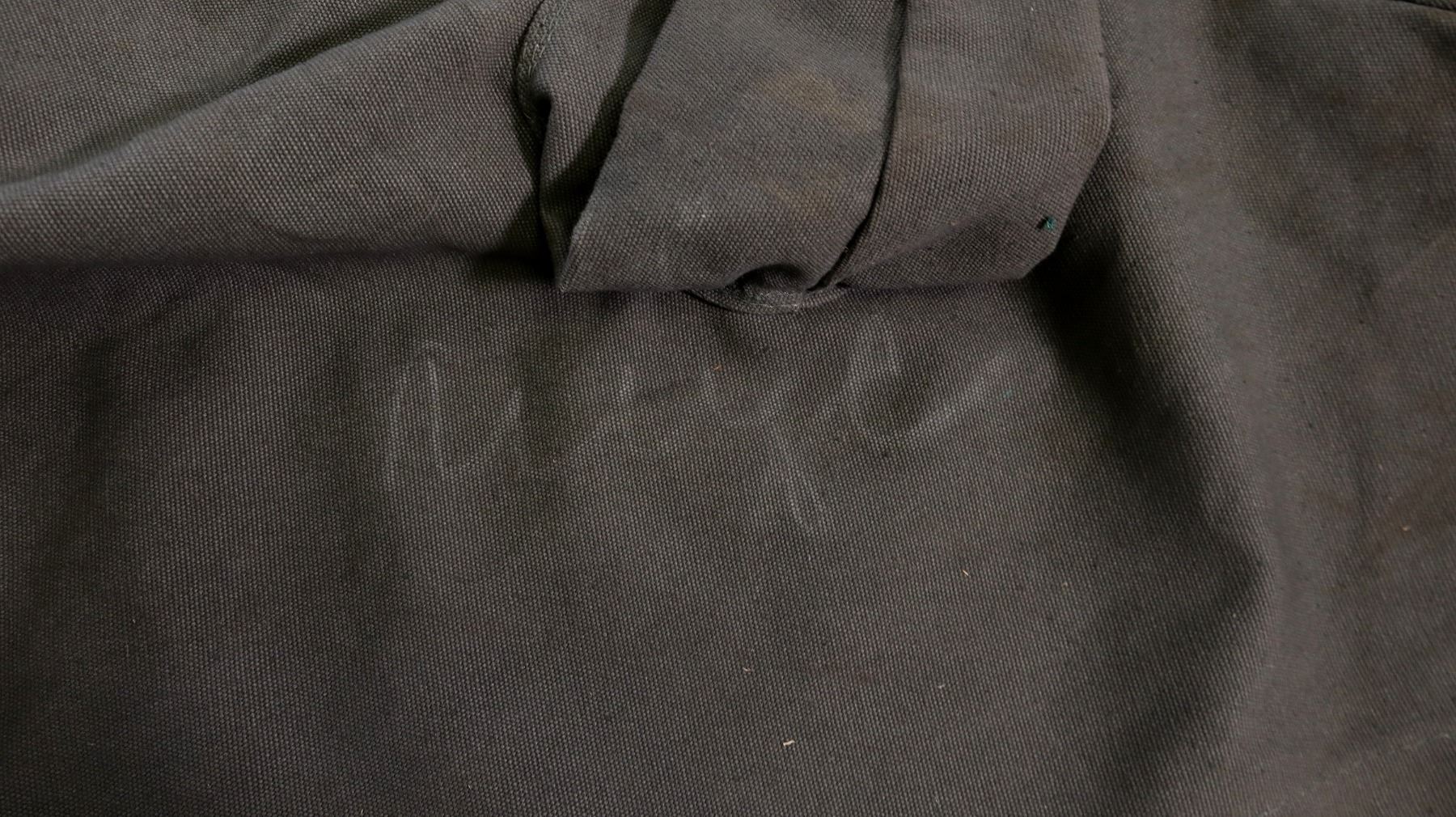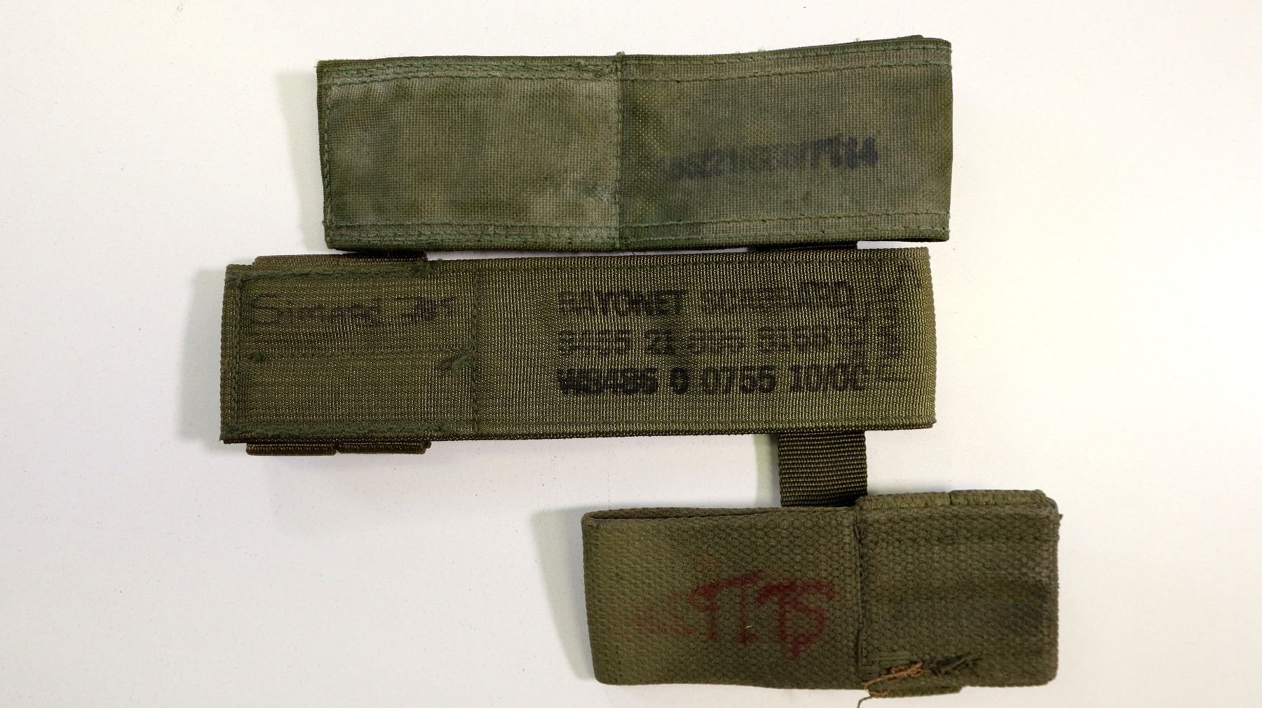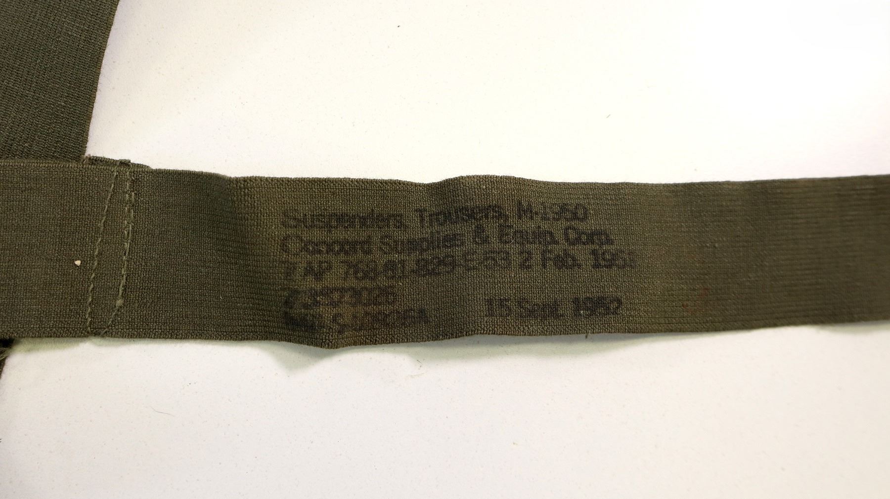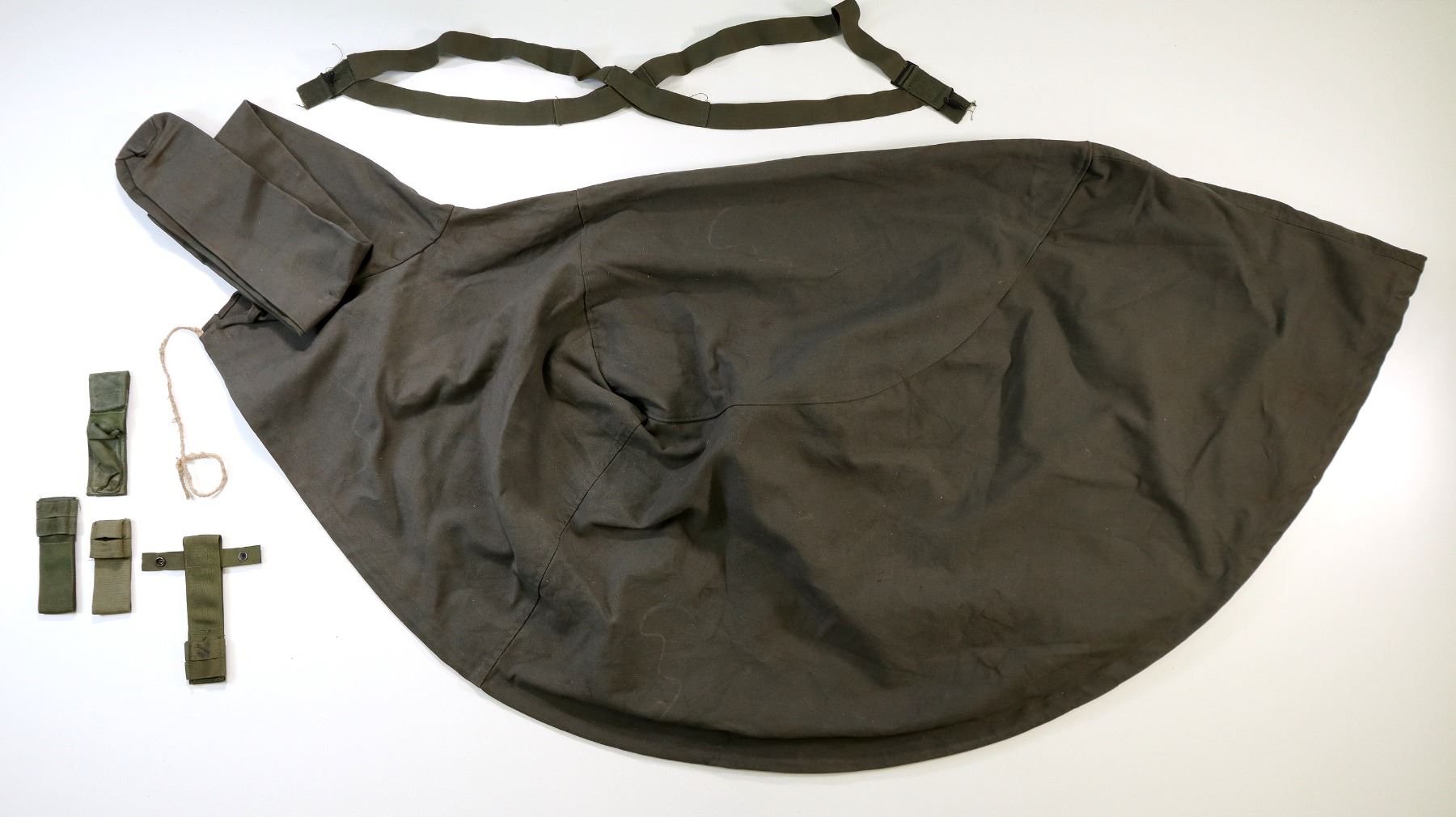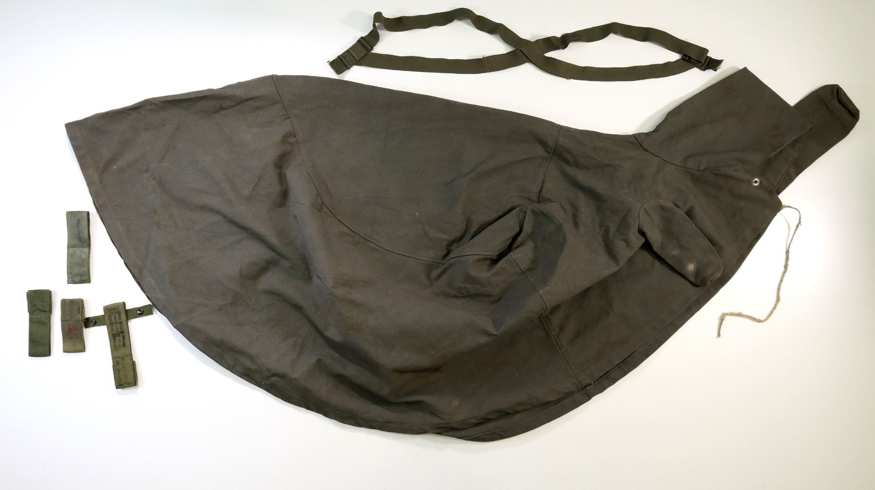 LOT INCLUDES; (1) GREY CANVAS MOUNTED HEAVY MACHINE GUN COVER, FAINT HAND-WRITTEN MARKINGS, ROPE DRAWSTRING & APPROX. 100" L X 73" W, (1) UNKNOWN MILITARY GREEN NYLON KNIFE / KFS HOLDER, VARIOUS FAINT / UN-CLEAR MARKINGS, BELT LOOP, OAL APPROX. 7", (1) UNKNOWN MILITARY GREEN PAINTED BAYONET FROG, VARIOUS HAND-WRITTEN MARKINGS, BELT LOOP, OAL APPROX. 5 1/8", (1) CANADIAN MILITARY GREEN NYLON BAYONET FROG, VARIOUS MARKINGS, BELT LOOP, OAL APPROX. 8 1/8", (1) UNKNOWN MILITARY GREEN NYLON BAYONET FROG, NO VISIBLE MARKINGS, BELT LOOP, OAL APPROX. 6.5" & (1) PAIR OF GREEN ELASTIC SUSPENDERS, METAL HOOKS / FITTINGS, VARIOUS MARKINGS, DATED 1950 - 1953 & OAL APPROX. 37". SEE PHOTOS.