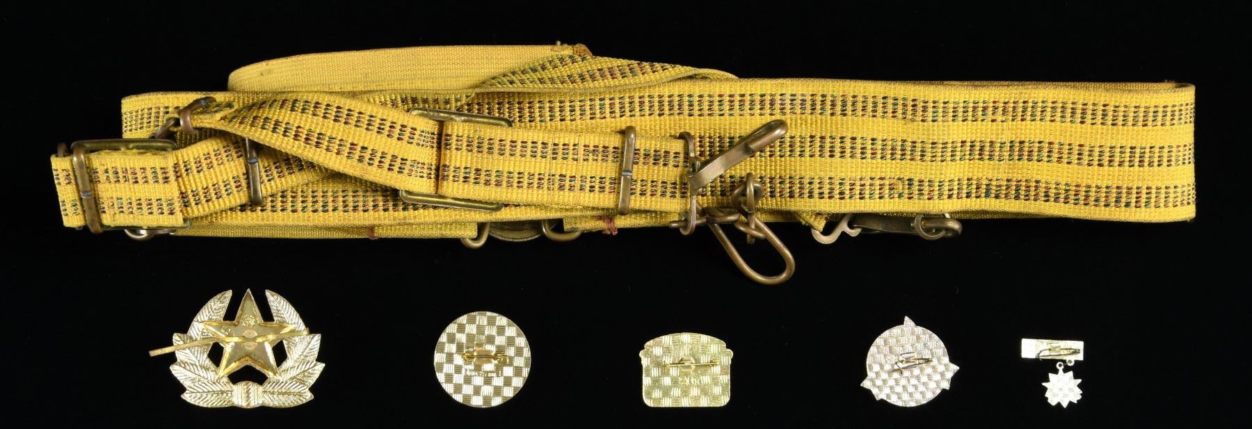 NON-ASSOCIATED PINS. This uniform is a blue/green color with four gilded star/hammer/sickle buttons on the front. The cuffs are piped in red, and there are seven ribbon bars at the left breast. The collar tabs are gold-trimmed black, featuring the insignia of a construction battalion. The shoulder boards appear to be for a captain. The belt has a two-piece oval buckle featuring a hammer/sickle/star inside a wreath. The belt is yellow cloth with three rows of multicolored embroidery and is complete with sword straps. Completing the lot is one Soviet star and wreath cap badge and four various Soviet pins with Cyrillic writing. CONDITION: All items generally show light wear. (02-23668/BF). $200-300.