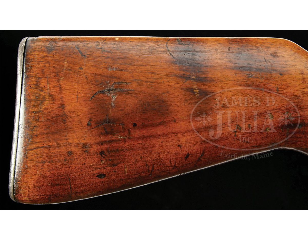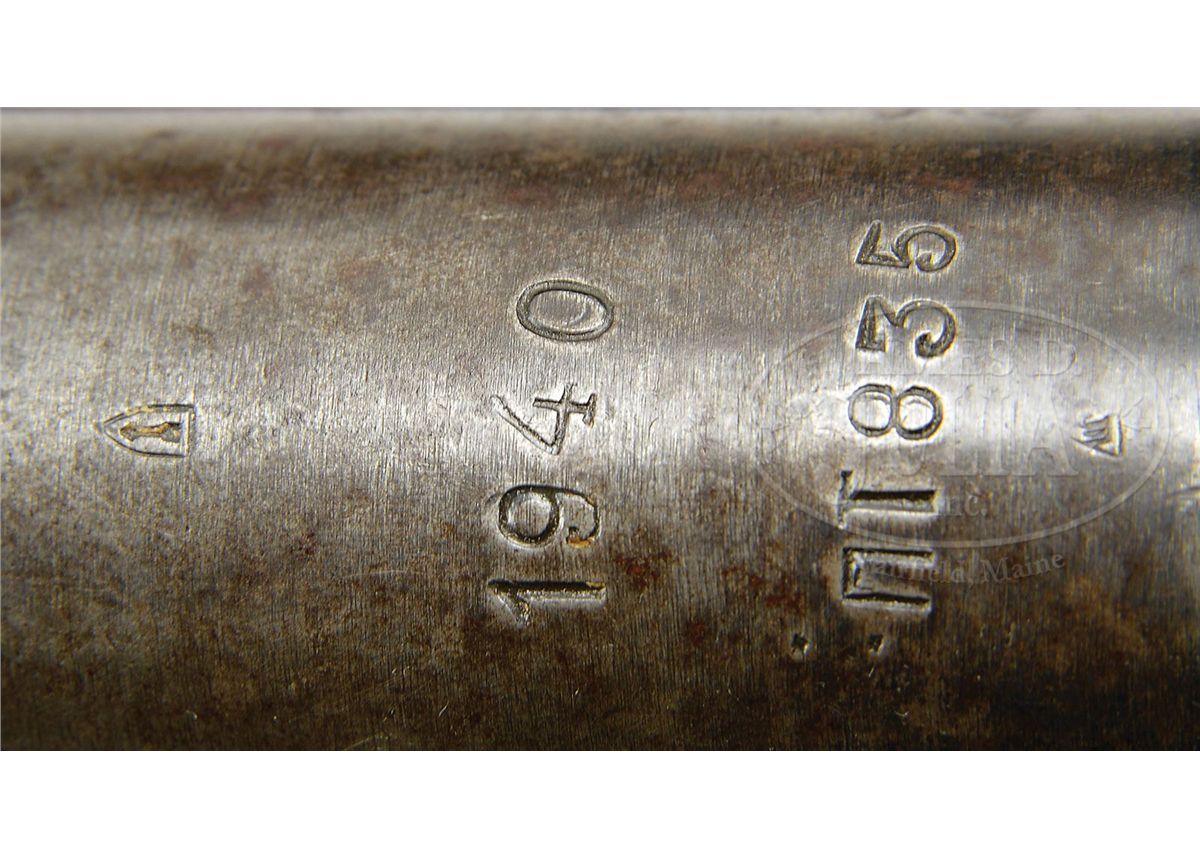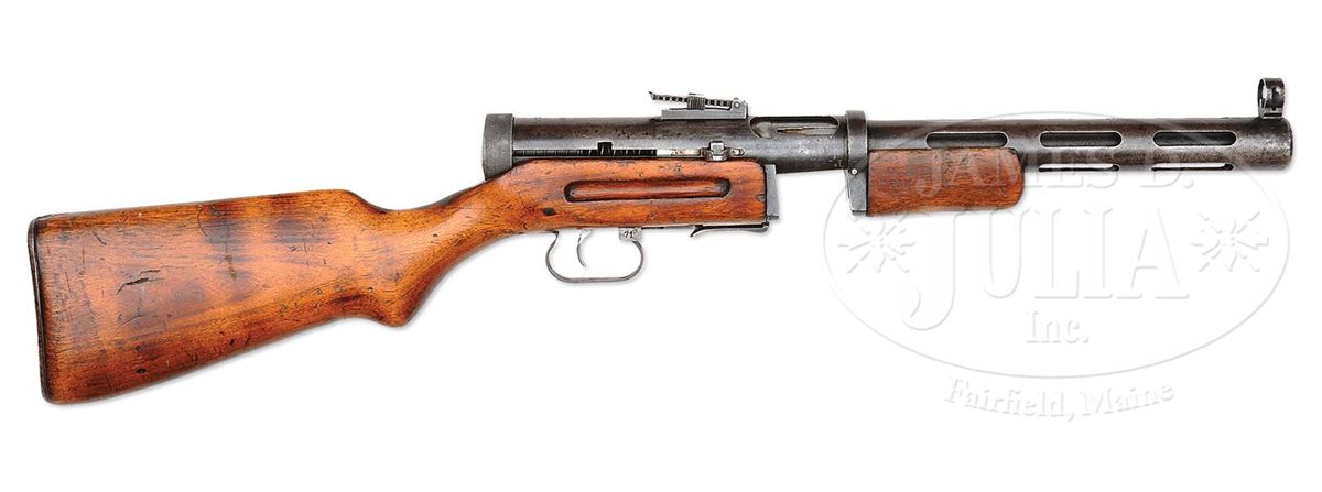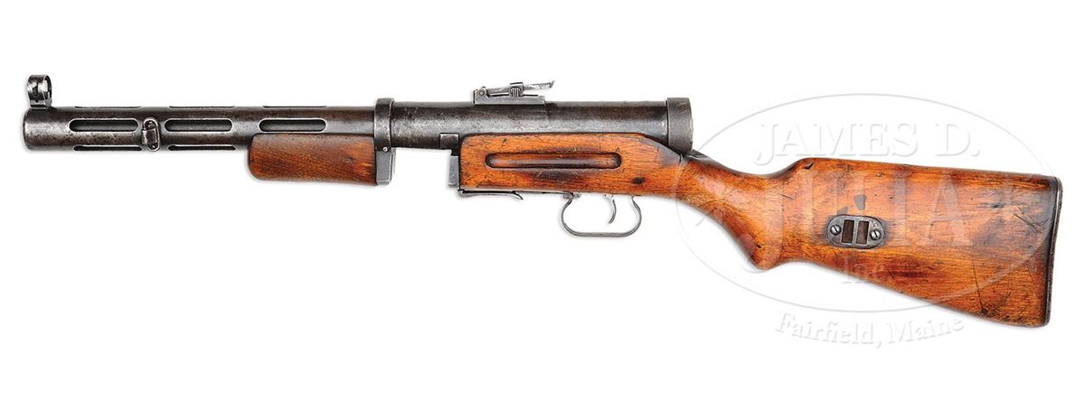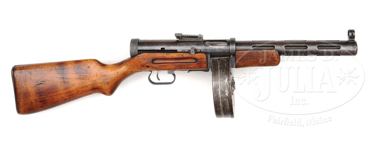 SN NT835. Cal. 7.62 x 25 mm. 10.75" bbl, manufactured by Russian Government Arsenal and dated 1940. Registered as "Russian manufacture MP 40". Cyrillic prefix letters not included on registration paperwork. Bolt matches receiver SN. This weapon includes one standard 30 rnd mag and one 71 rnd PPsh 41 drum mag which is not orig for this weapon. Selector forward of trigger guard is marked "1" for semi-auto fire and when flipped is marked "71" for full auto fire (isn't it neat they assume the soldier will fire the entire magazine). Proof mark on top of receiver is the Izhevsk "keyhole" arsenal symbol of a small arrow inside a triangle. The PPD was the Soviet Union's first effective machine pistol. It was designed by Vasiliy Degtyarev, and machined from forgings. It was the precursor to the less expensive and much produced PPsh 41. PROVENANCE: Collection of Carl "Bill" Morrison. CONDITION: Overall finish and appearance is about 60% with the blue turning to a pleasing soft brown patina. 30 rnd mag is excellent, over 90% deep blue finish. 71 rnd drum mag has about 5% remaining of white paint, the rest is patina, however spring tension is good and the mag appears fully serviceable. Buttstock and forend is in good overall condition, showing numerous gouges, some chips, and there is a crack to the rear of the receiver on the right side, running about 1" to the rear and then forward 2" on the right side only. There is also 1/2" crack on left side of buttstock just to the rear of the mag housing. Buttplate is devoid of orig finish and instead has significant brown corrosion and patina. Bore is shiny and bright, however has evidence of multiple bulge rings. It appears as if a bullet may at one time have lodged in bbl and firing continued. There is no detectable bulge to exterior of bbl. This cataloger would not hesitate to fire this gun. Bolt face is good, however could use a cleaning, as could the interior of receiver. Bolt has some evidence of active corrosion along left side and interior grooves, but this should clean up. Leather buffer inside buffer cap still present, soft and serviceable, although thinning. Both sides of trigger show rubbing wear against trigger aperture. A nice example of a scarce Russian submachine gun. 4-48646 JWK3
