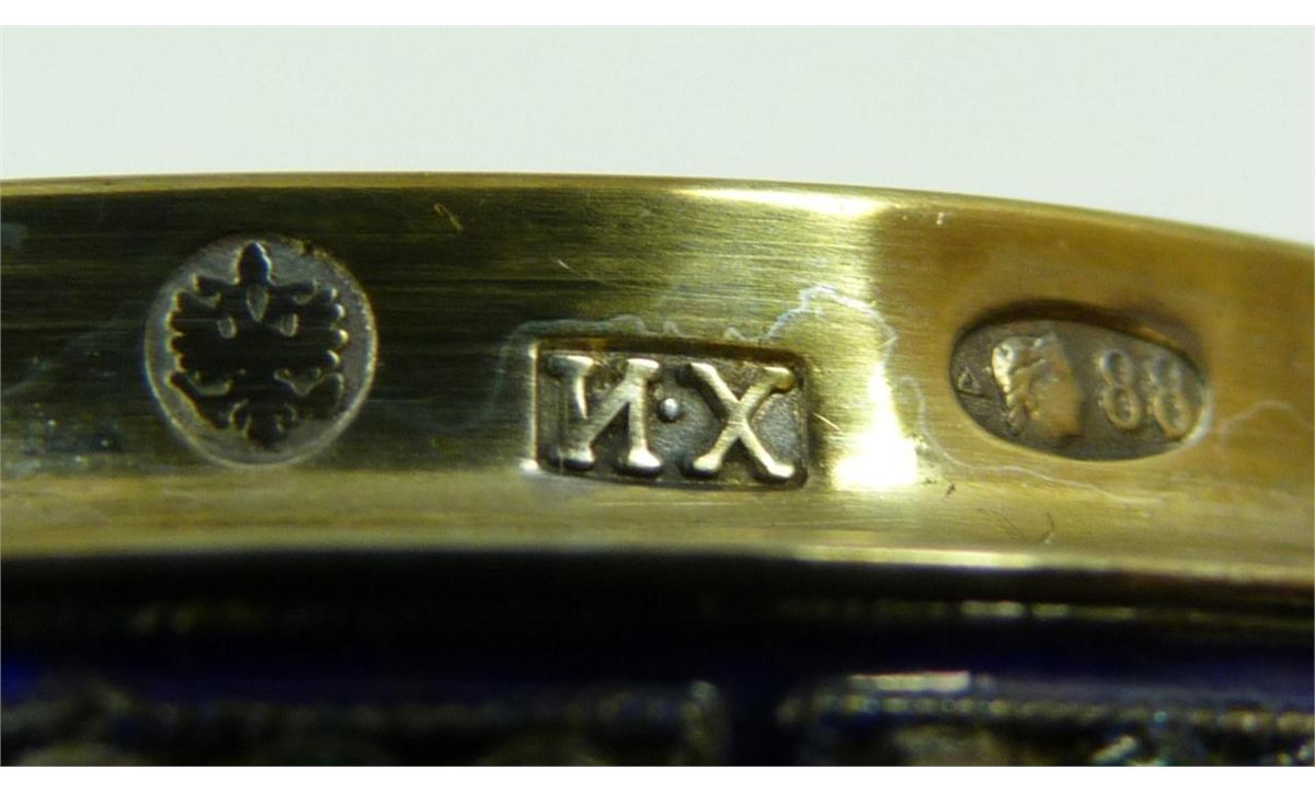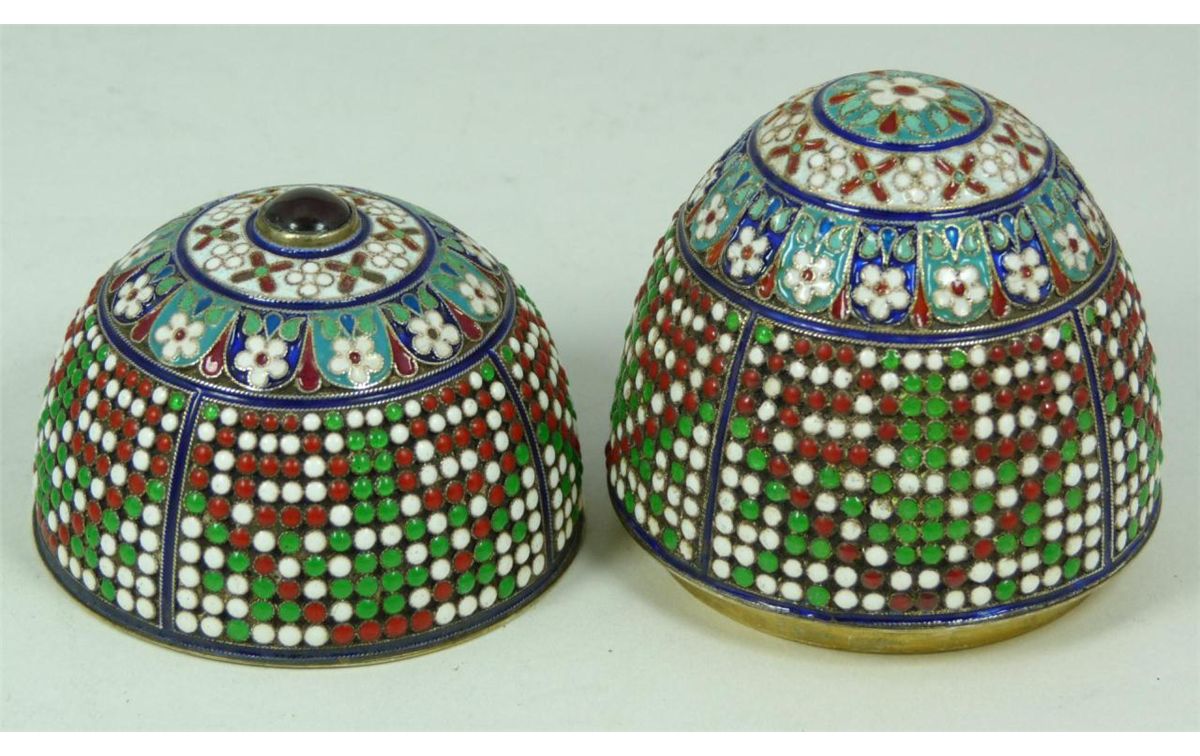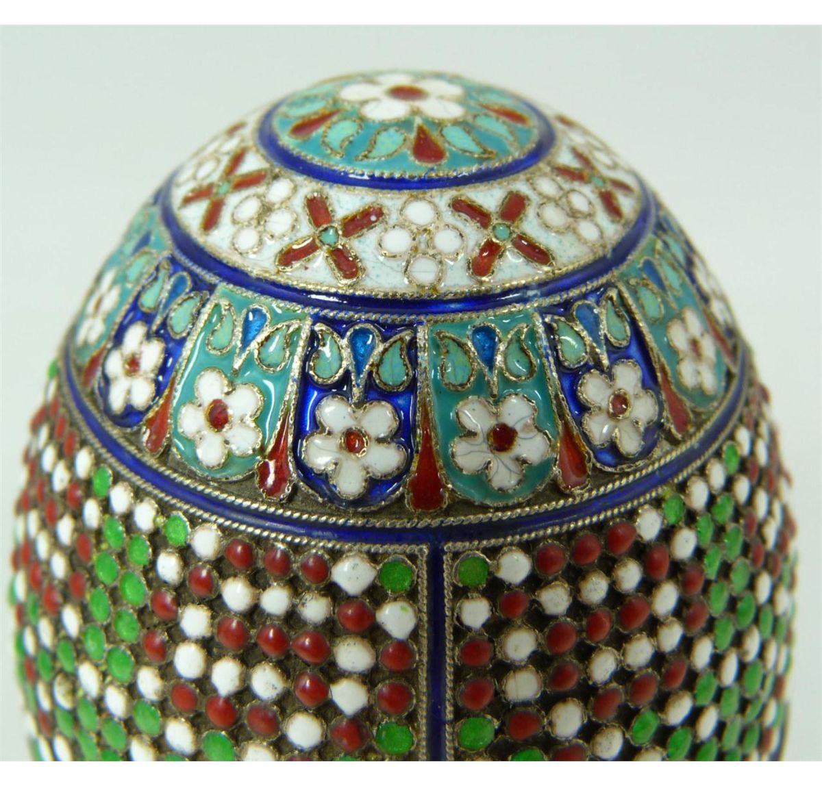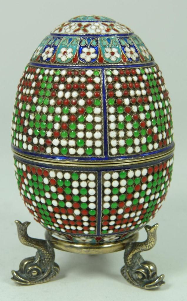 Russian silver enameled egg box having multicolor beaded floral design throughout exterior. Hold round cabochon cut garnet jewel to bottom of egg. Gold wash interior. Includes stand with three figural fish feet. Holds Cyrillic Ivan Petrovich Khlebnikov workmaster marks with double headed eagle mark. Holds 88 silver purity mark with Moscow town mark. Holds marks to both sides of interior and on lip. Base marked 84. Measures 3" height x 2" diameter + 1/2" base height (7.6cm x 5.1cm + 1.3). Total weight of 4.4ozt.