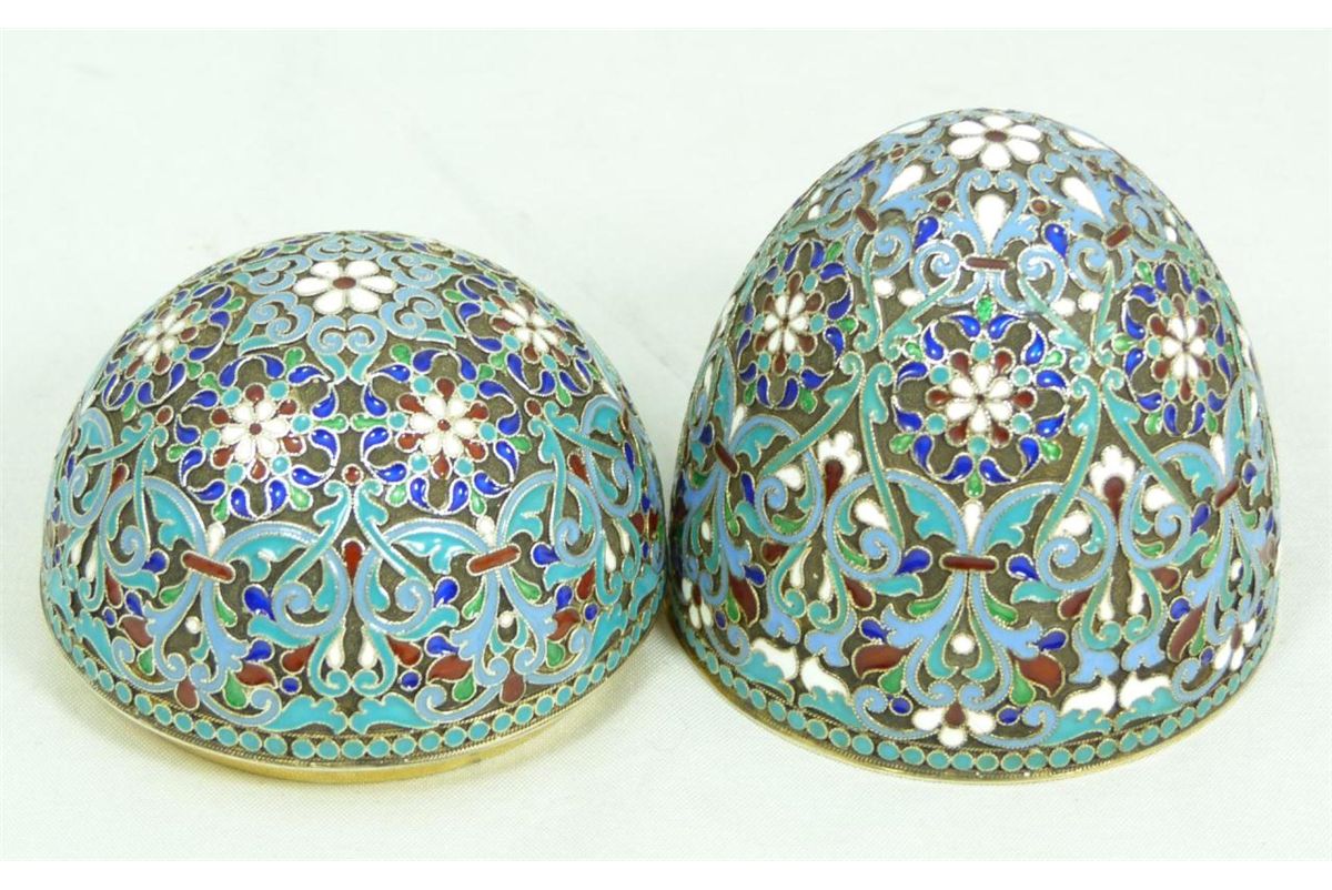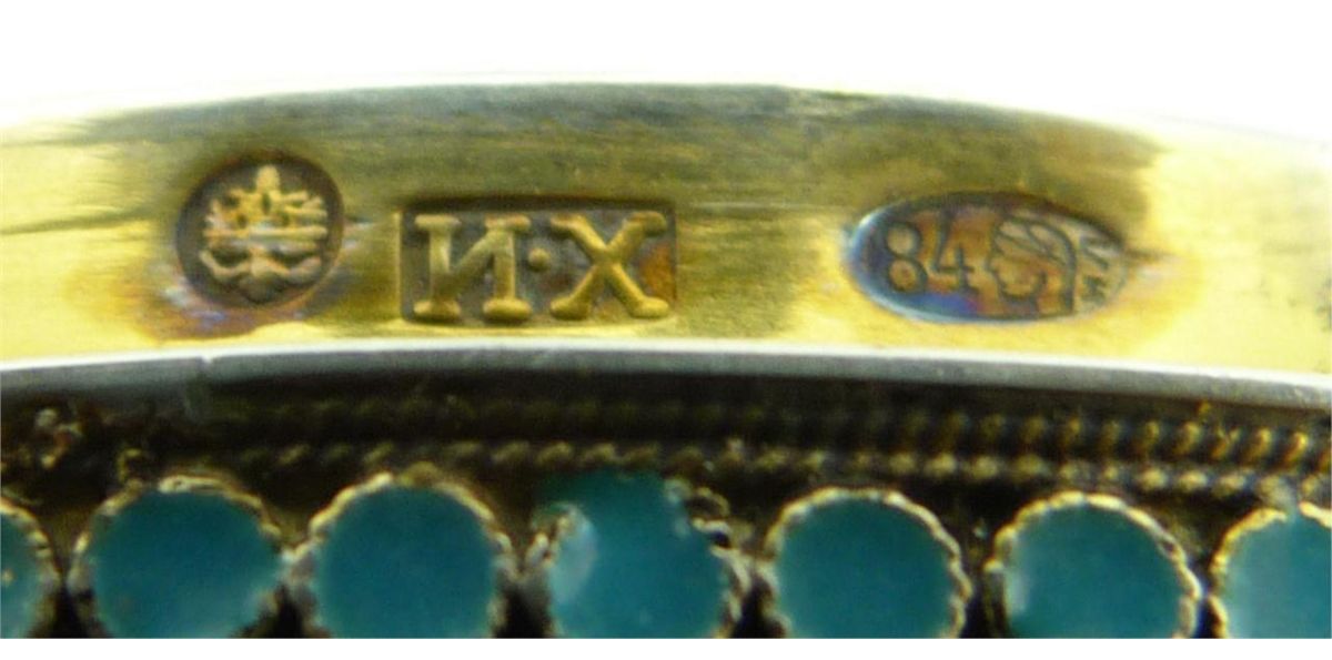 A Russian silver enameled egg box having scrolled floral design throughout. Gold wash interior. Includes stand with three figural eagle feet. Piece holds Ivan Petrovich Khlebnikov workmaster marks. Holds 84 silver purity mark with town mark. Holds marks to both sides of interior and lip. Base marked 84. Measures 3 1/2" height + 3/8" base height (8.9cm x .95cm). Total weight of 5.24ozt.